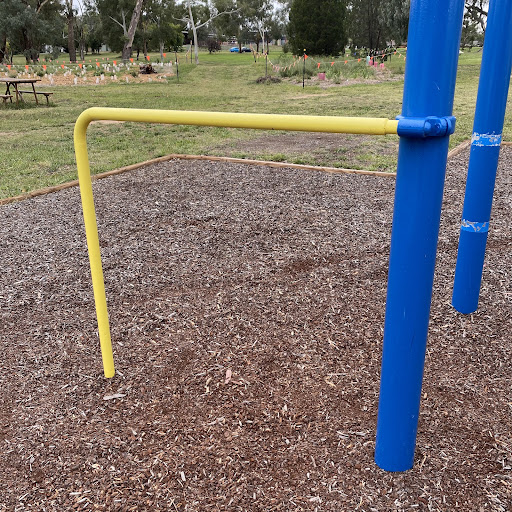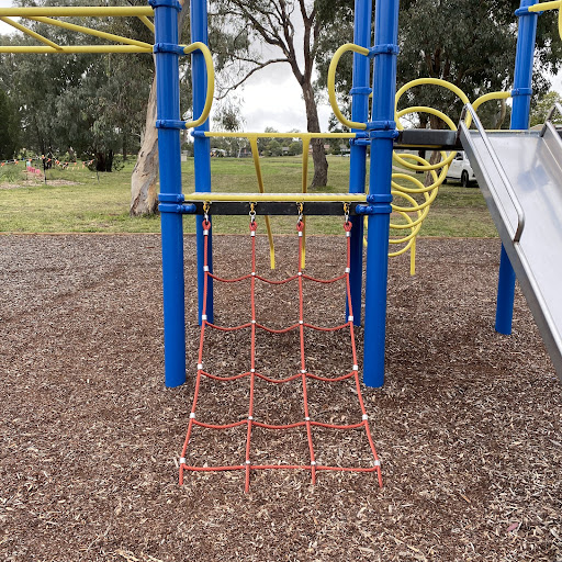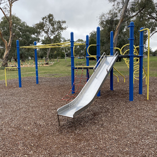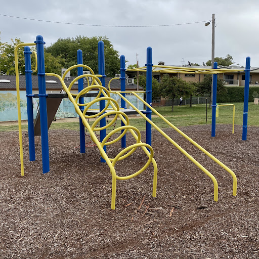 This updated playground offers a mix of play equipment including monkey bars and a metal slide, alongside a practice skate ramp. It is conveniently located behind local shops with accessible public toilets and a picnic table facing the play area. Recent upgrades to flooring and paint have enhanced the play experience.