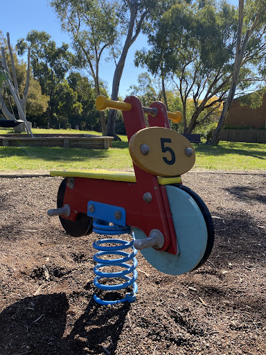 Located in Pat Rubly Park, this playground offers a unique metal obstacle structure featuring a vertical ladder, a sliding pole, monkey bars, and an acrobatic swing bar, providing active play opportunities. It also includes a metal slide and a fun spring motorcycle for two riders. A single bench seat faces the playground, and convenient street parking is readily available.