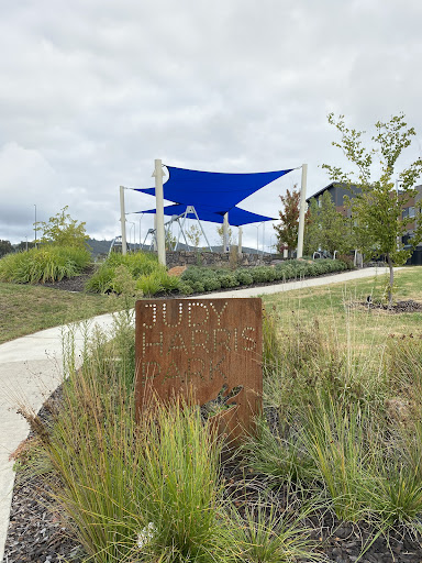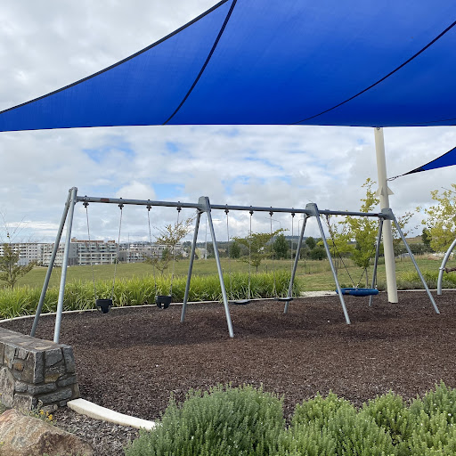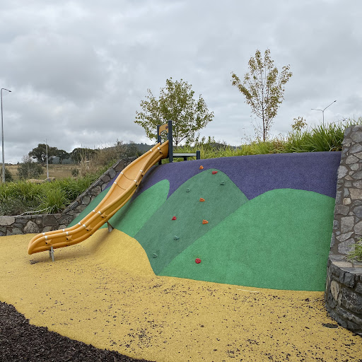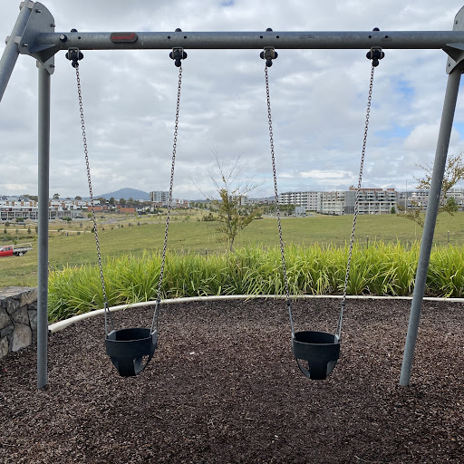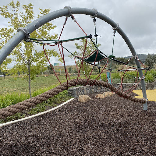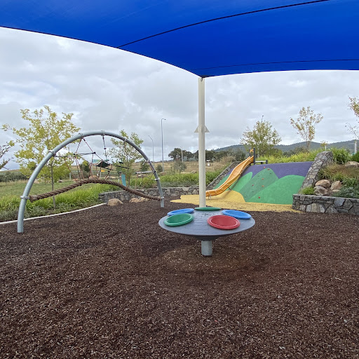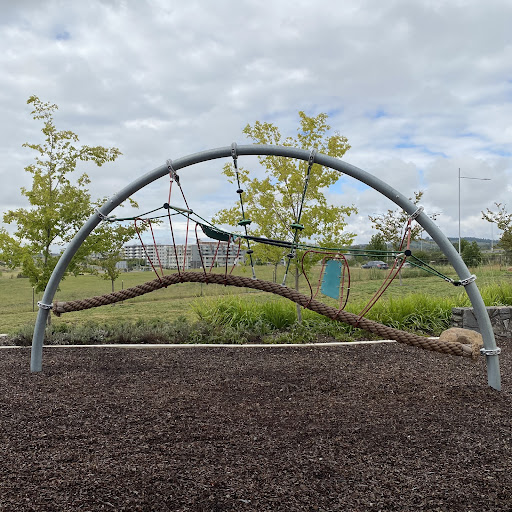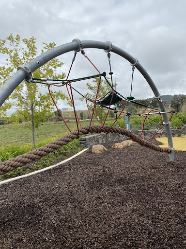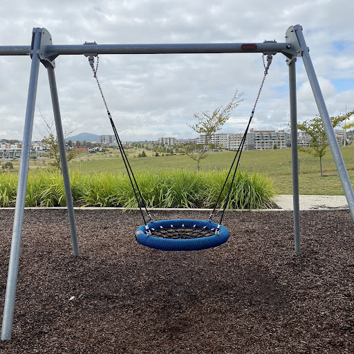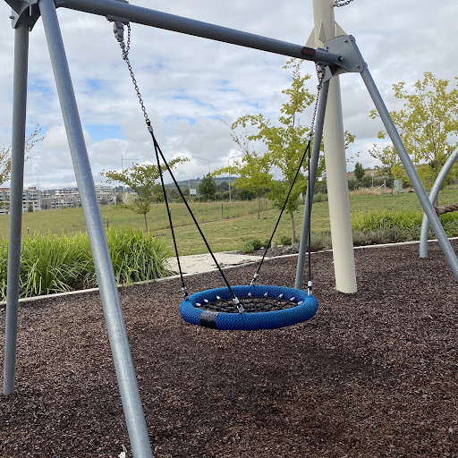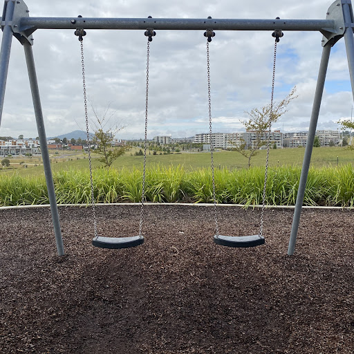 Judy Harris (North Coombs) Park is a well-shaded playground featuring a good selection of swings for all ages, including toddler seats, and engaging climbing structures. Visitors enjoy the unique spinning UFO and the mould hill with a climbing wall leading to a curved slide. The park offers benches and a drinking fountain, making it a pleasant spot for a short visit, though parking is quite restricted.