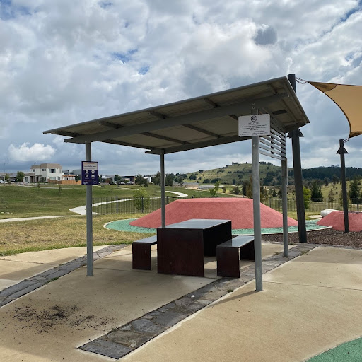 This playground offers a unique experience with its scenic views and artistic features, including spiral patterns and large pebble stone sculptures. It provides a safe play area with soft ground covering and a sheltered picnic table, perfect for a relaxed outing. The playground includes a metal slide and a swing set, alongside large mound hills. Convenient parking, including disabled spots, is available.