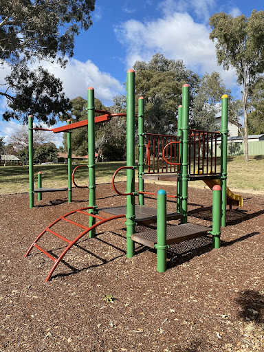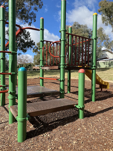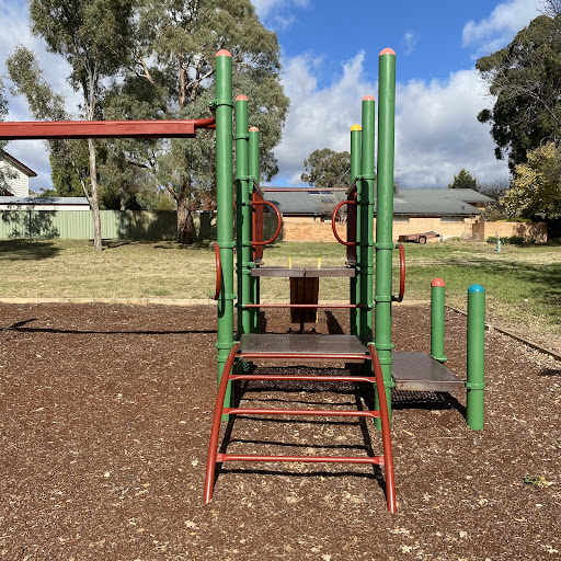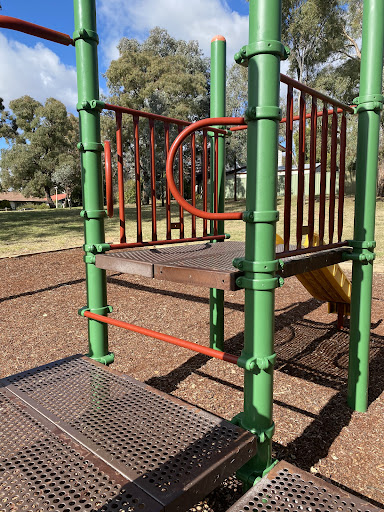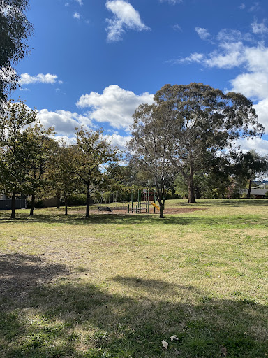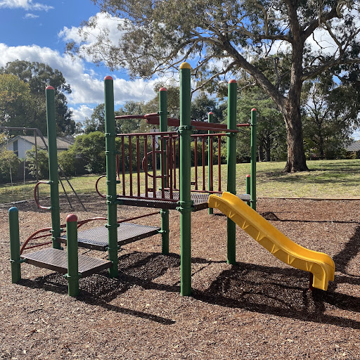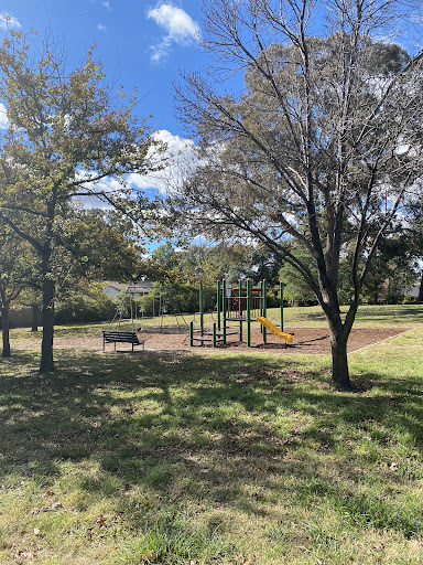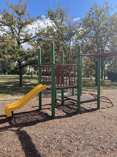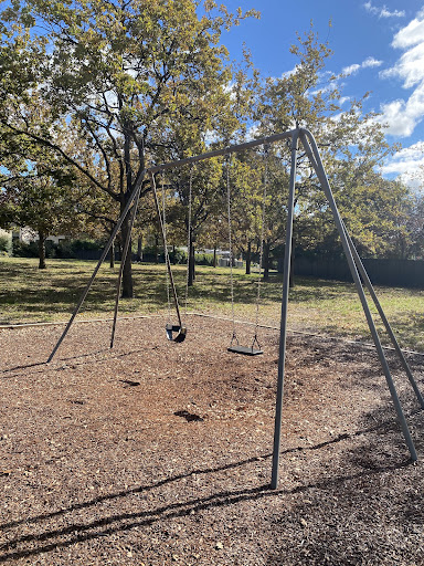 This playground is designed with toddlers in mind, featuring a small play structure with a slide and a swing set that includes a toddler bucket seat. The playground benefits from tree shade and has a bench for parents. It’s a good spot for younger children to play.