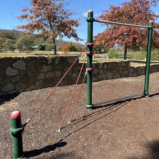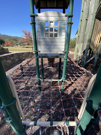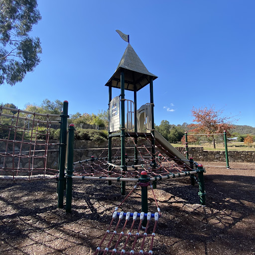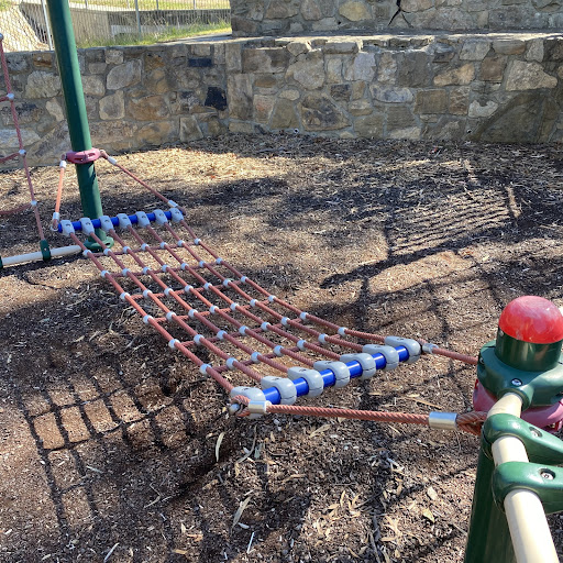 This playground is situated next to Hilton Pond, offering a pleasant view of the water and ducks. For adventurous children, there are rope climbing elements and a slide. The surrounding area includes bench seating facing the pond and natural tree shade.