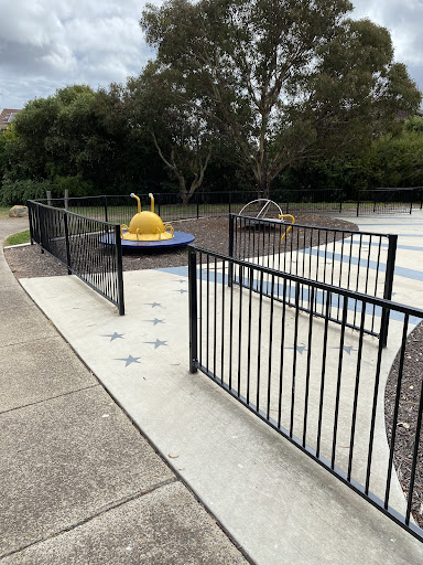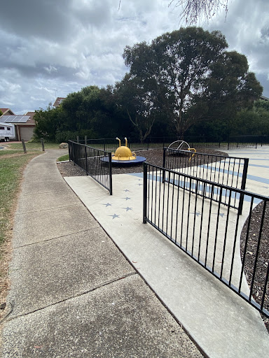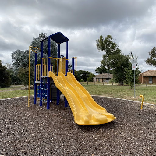 This playground offers new equipment suitable for toddlers, including a double slide and swings. It’s located in a quiet cul-de-sac with surrounding trees that provide some shade. The park is a nice place for families seeking a peaceful play environment.
