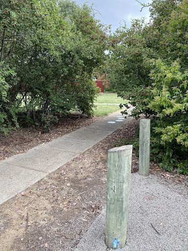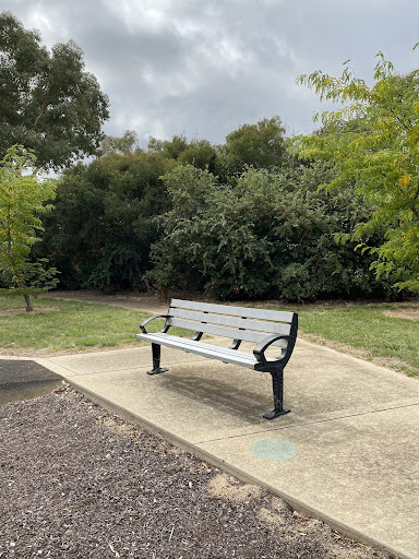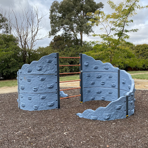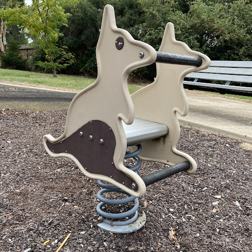 This older-style playground features a unique, cloud-like plastic rock climbing structure that is great for younger climbers. It offers a standard seat and a toddler bucket chain seat on its swing set, as well as a kangaroo spring seesaw. The park includes a bench and a picnic table, and there is some tree shade. Small parking spaces are available near the playground entrance.