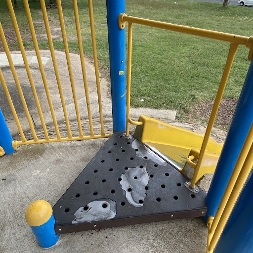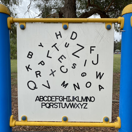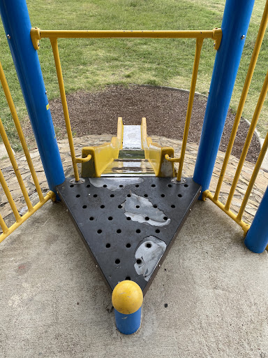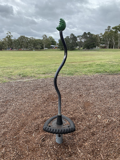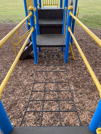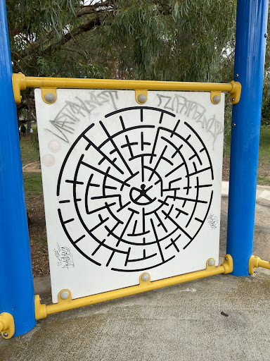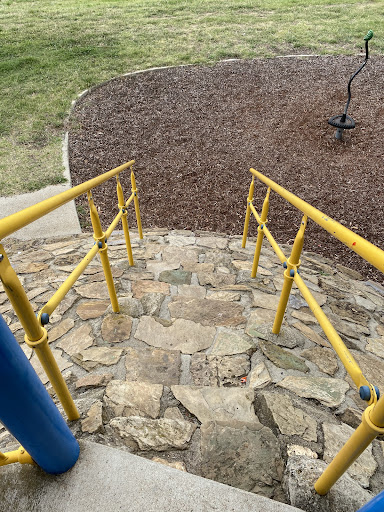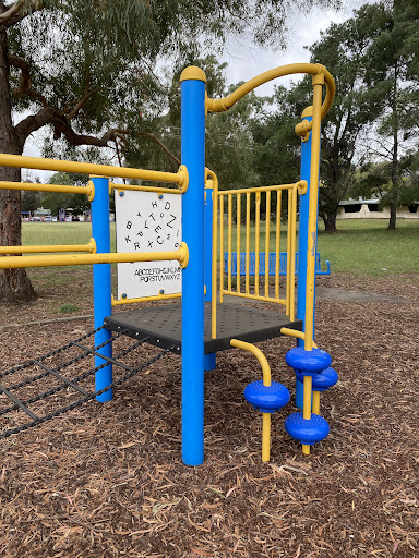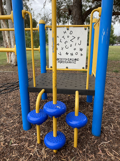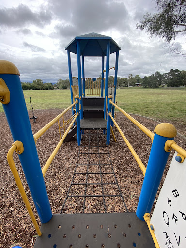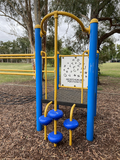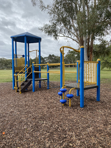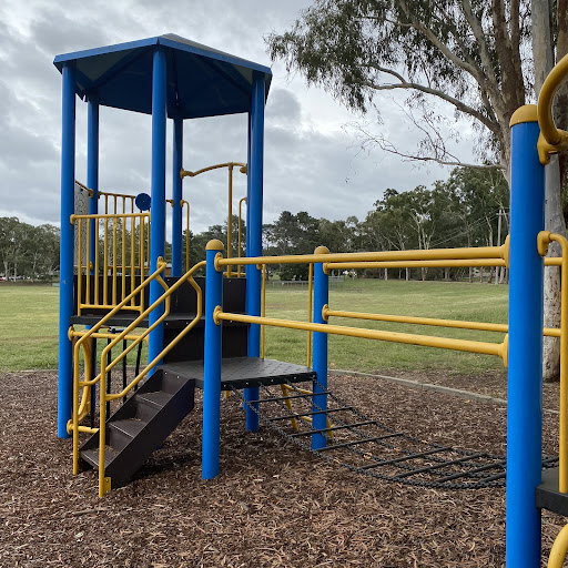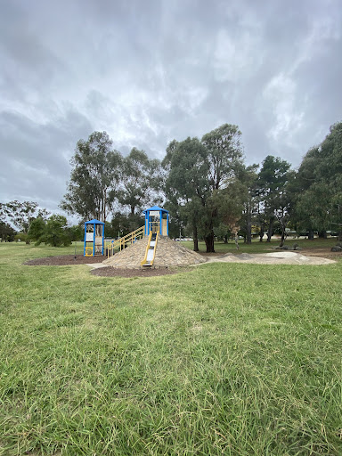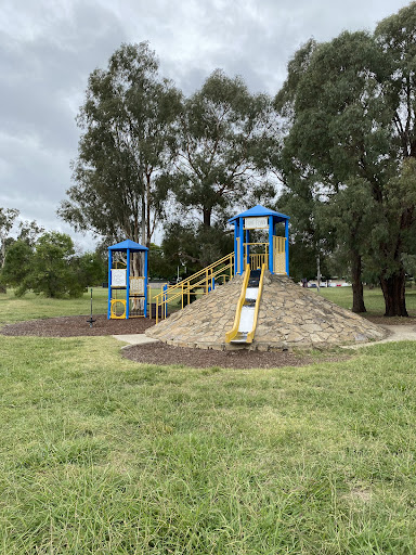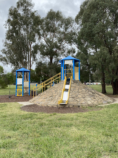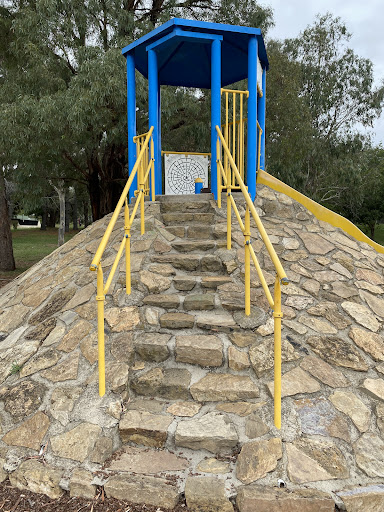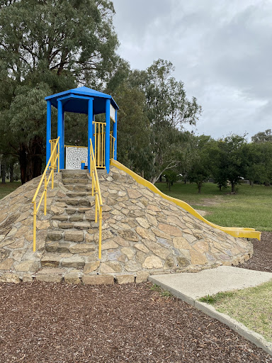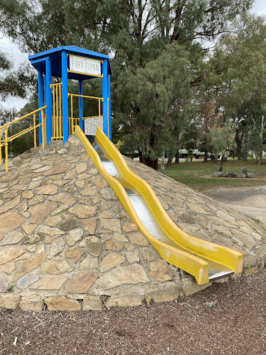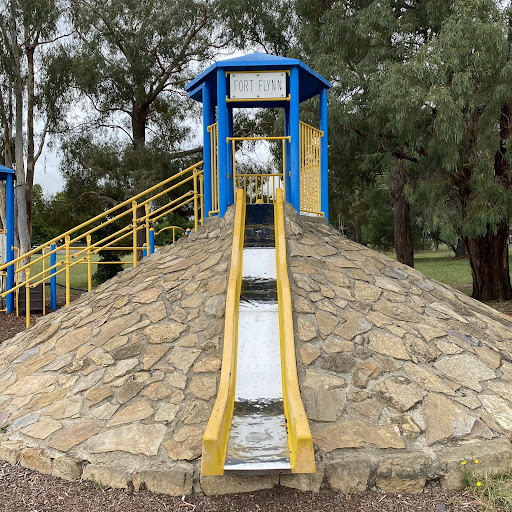 This playground offers an adventurous experience with its distinctive stone fort, known as Fort Flynn, complete with a large, wavy metal slide and challenging climbing elements. It also features a separate play structure with a variety of climbing and interactive activities, plus a mini bike obstacle area for aspiring cyclists. The surrounding trees provide good shade, and the adjacent oval is perfect for running around.