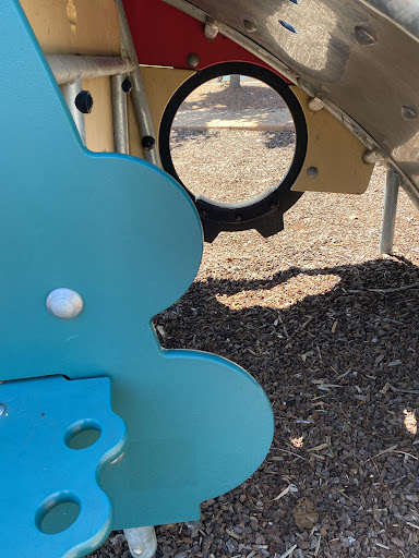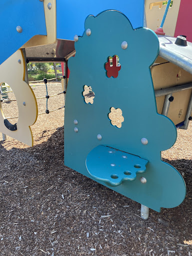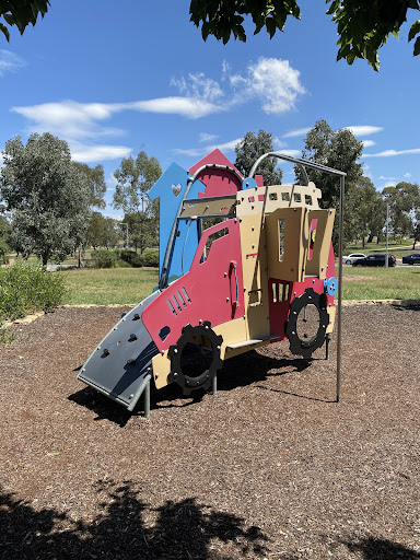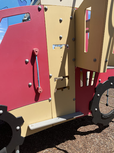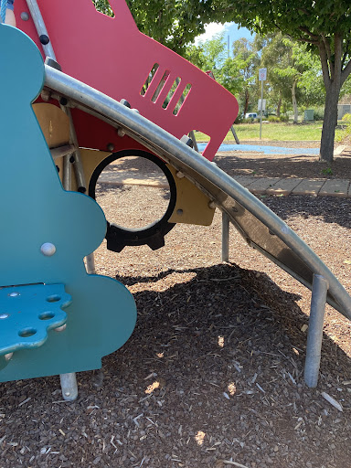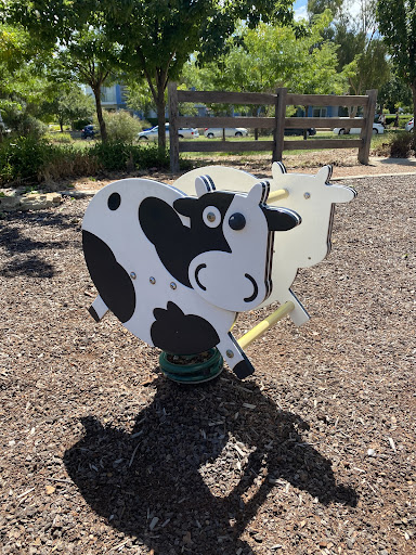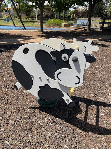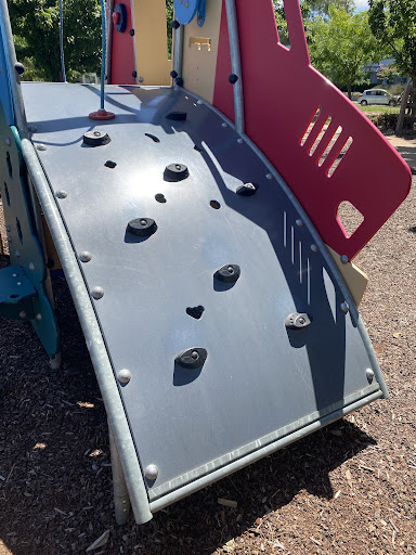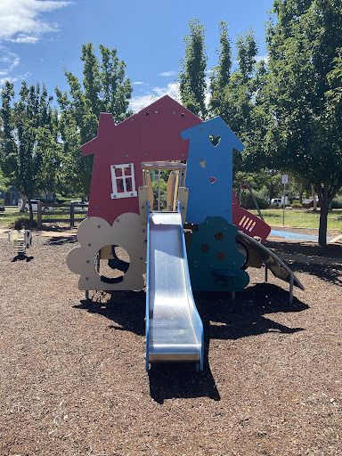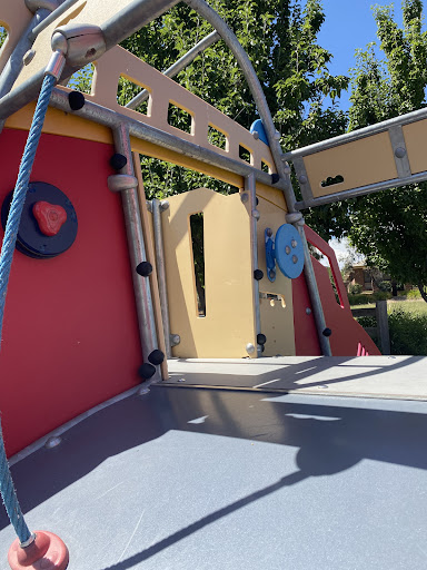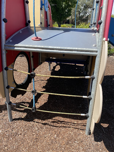 This playground offers a good range of play equipment, including swings, seesaws, and a climbing structure with a slide and rope ladder. It is complemented by picnic tables and bench seating, all nestled under the natural shade of trees, making it a pleasant spot for families.