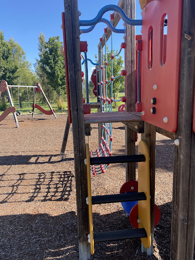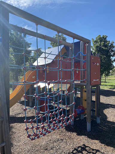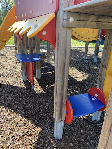 This wooden playground is a popular spot for families, offering a good variety of equipment that keeps toddlers to primary-aged children engaged. The playground features a large wooden structure with a slide, rope obstacles, and a cubby house, alongside a standard swing set and unique seesaws. While the play equipment itself is not shaded, there are several bench seats located under the shade of trees, providing a comfortable spot for parents to relax.