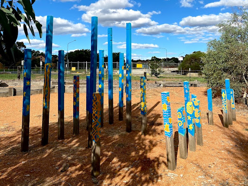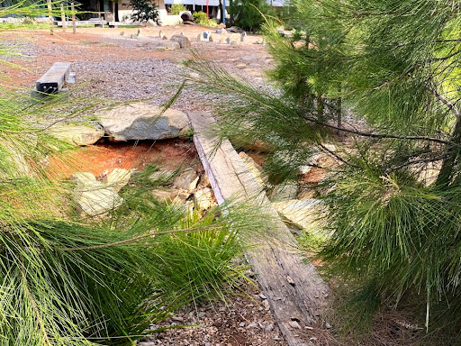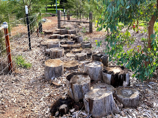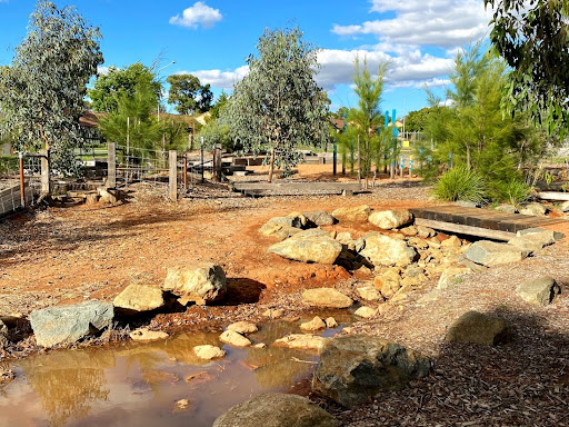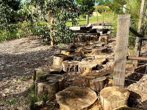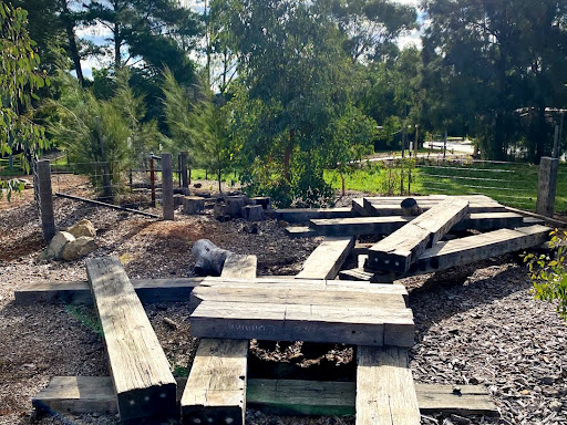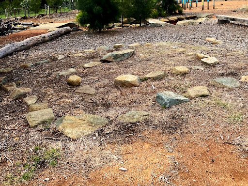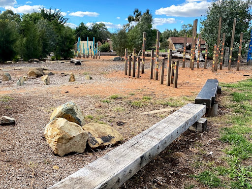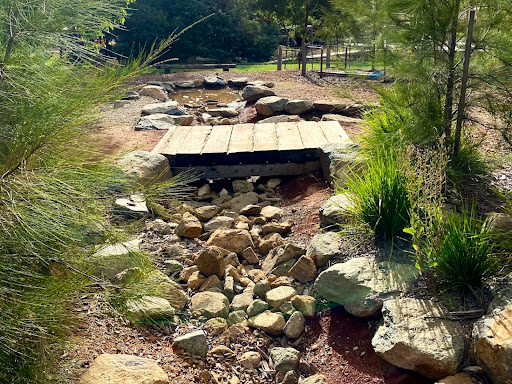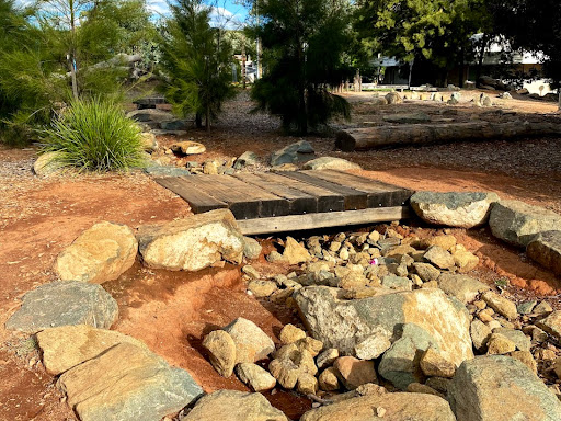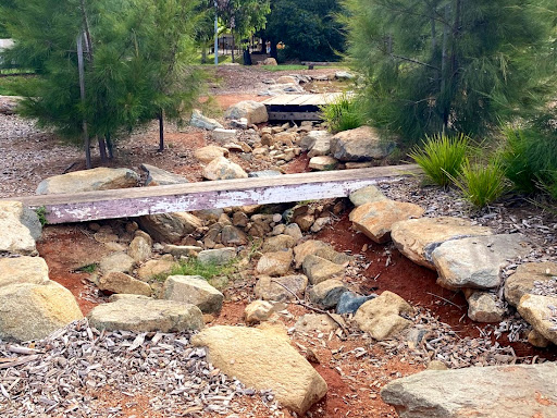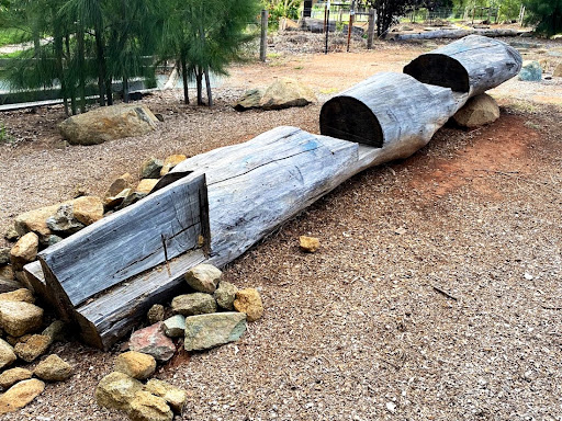 A new nature playground that fully embraces natural elements, this spot is constructed entirely from rocks and wood, offering a unique space for children to climb, balance, and jump. Features include a Totem Pole Maze, climbing logs, stepping logs, a dry creek bed with bridges, and a solar rock clock. The playground also boasts a rocket ship log structure and ample wooden benches, many situated under tree shade, providing a delightful environment for exploration and fun.
