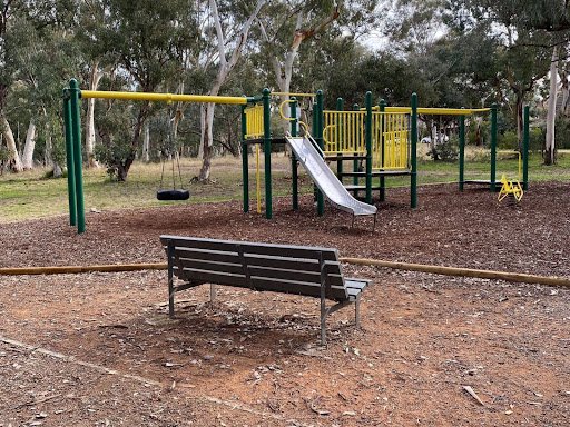 Gowrie Playground offers a play structure that includes a metal slide, a tyre swing, and a mini flying fox. It is situated in a grassy open field, providing ample space for children to play. Tree shade is available, offering a pleasant environment for families.
