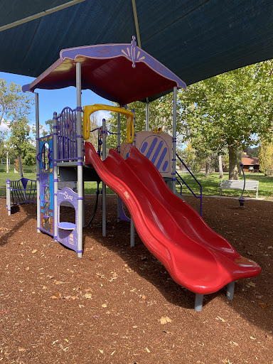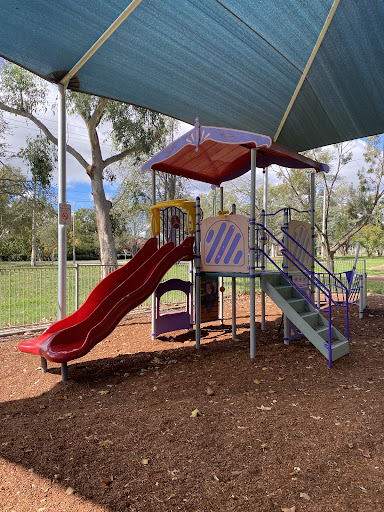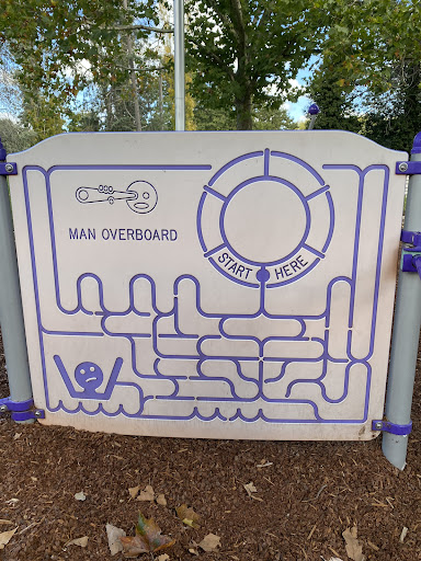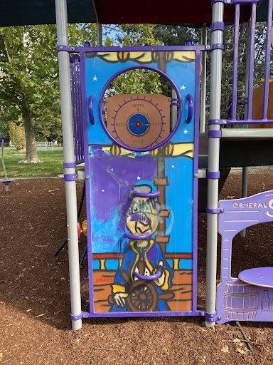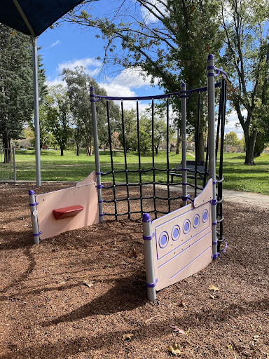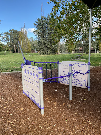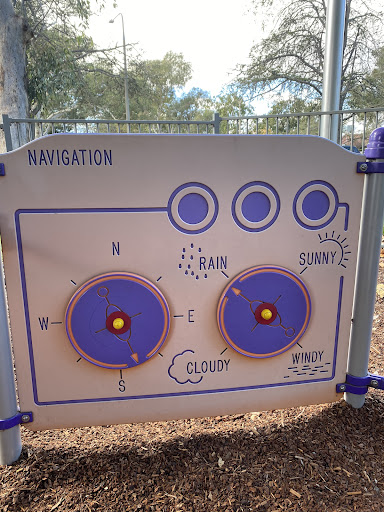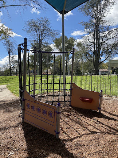 This playground offers an excellent play experience with a prominent ship theme, featuring structures like a bow, boat, and stern play areas. Kids will enjoy the slides, climbing walls, interactive games like mazes and compass walls, and a spinning mast. The playground is well-shaded by a large shade cloth and has bench seats for parents, with picnic tables available for family outings.
