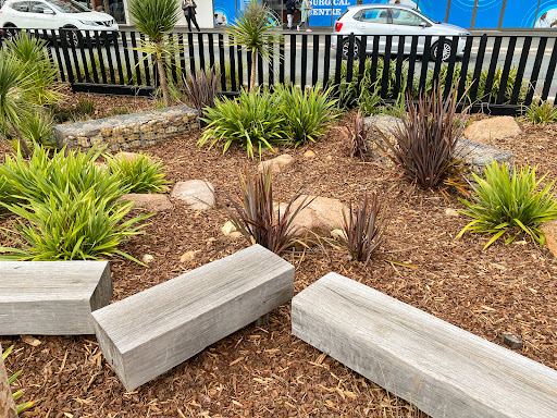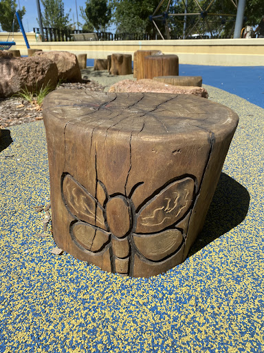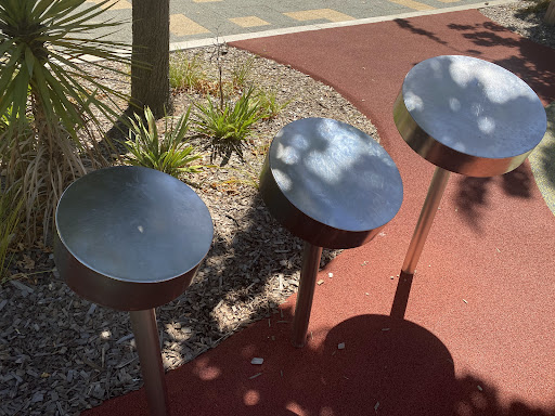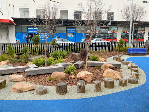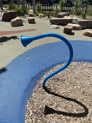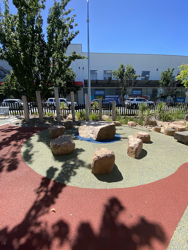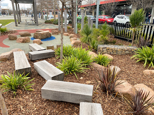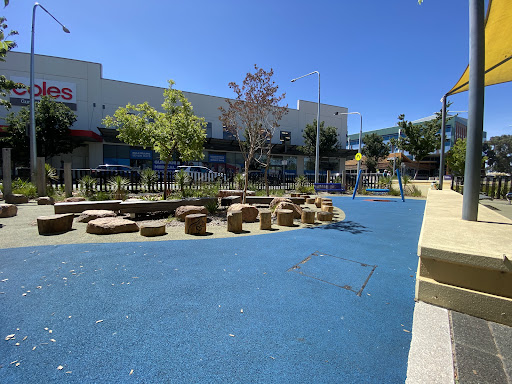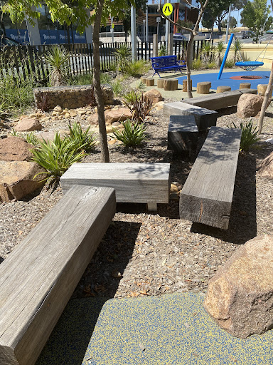This well-equipped playground is conveniently situated near shops, offering a variety of play experiences for children. Highlights include a circle net swing, stepping logs with animal designs, musical drums, and a climbing structure. The playground features a large shade sail and natural tree coverage, with paved paths making it easily accessible.