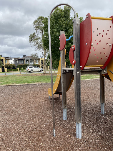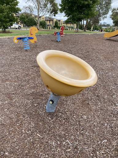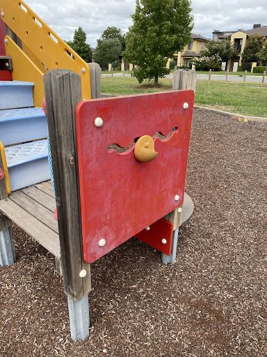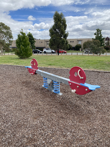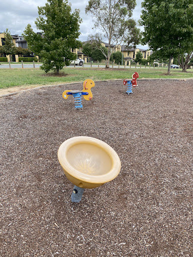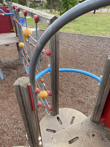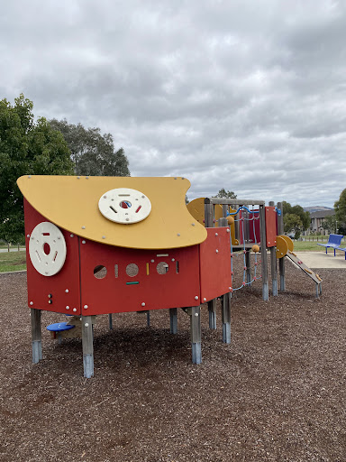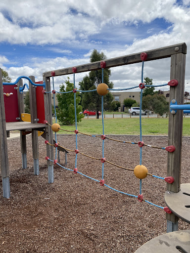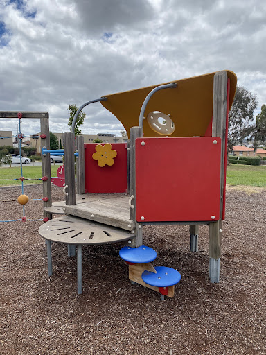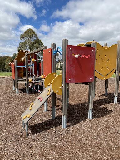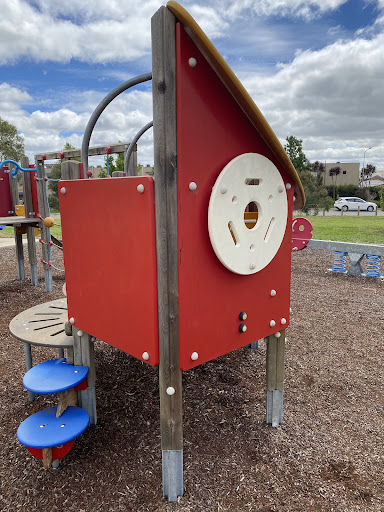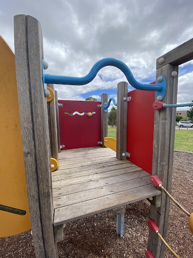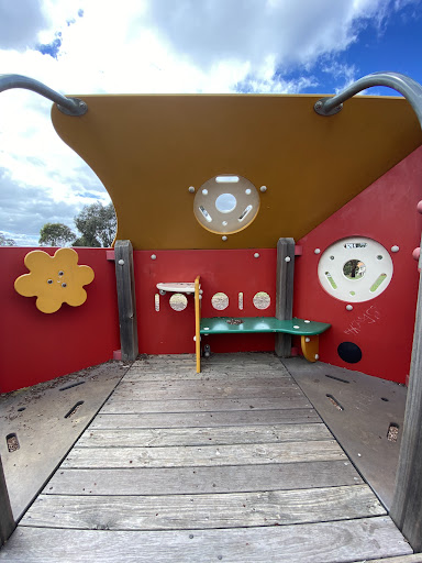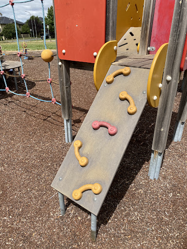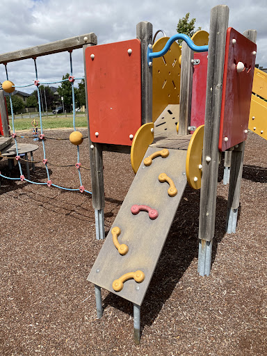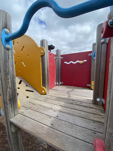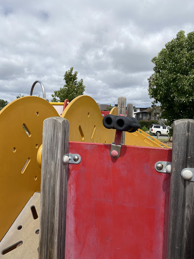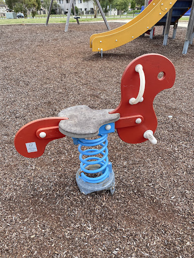 Mary Gillespie Playground is a large and engaging park filled with a wide array of equipment suitable for toddlers and younger children, offering plenty of challenging elements to develop climbing skills. Highlights include a large play structure with a rope climbing obstacle, rock climbing wall, binoculars, and a sliding pole, alongside a seesaw, rocking horses, and a spinning cup. The park is designed to foster imaginative play and provides benches for seating, making it a captivating spot for families.