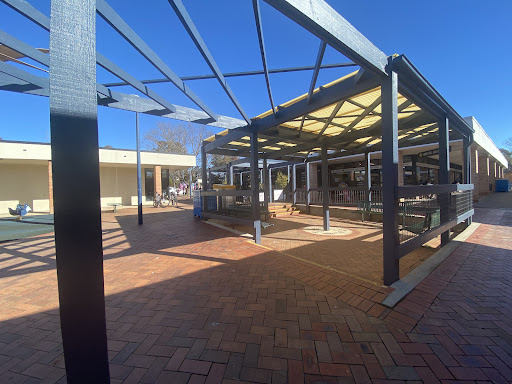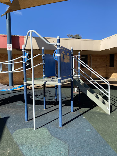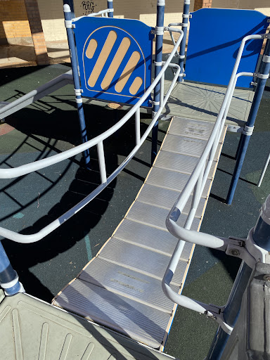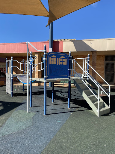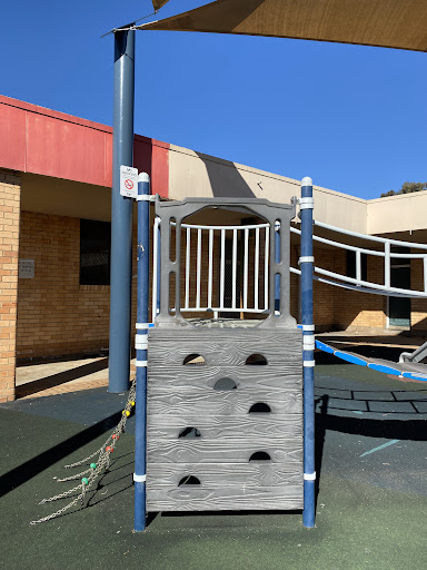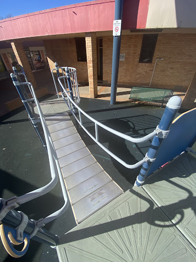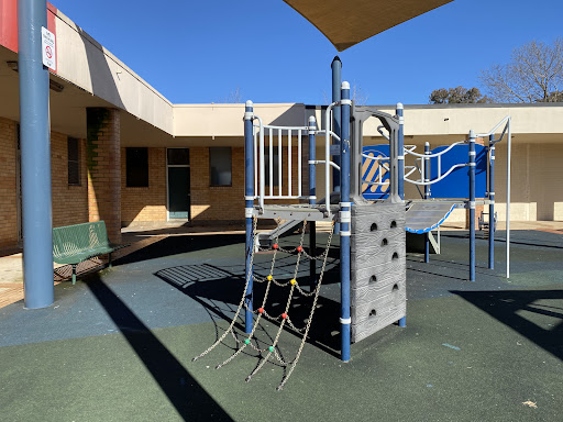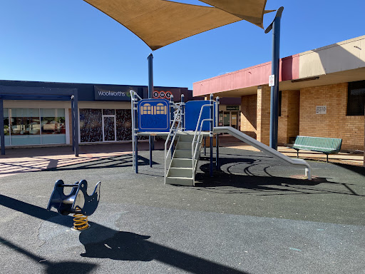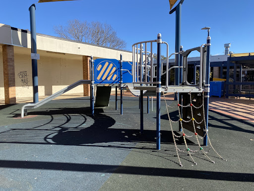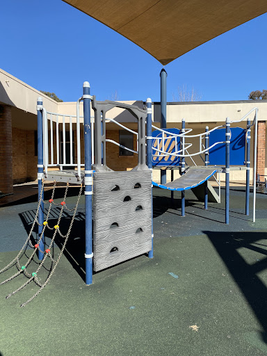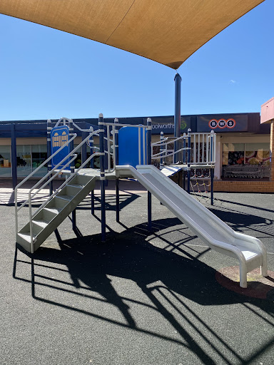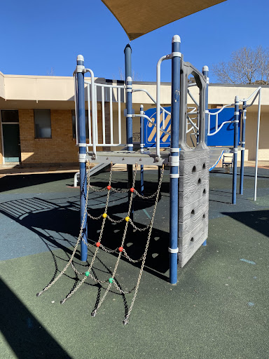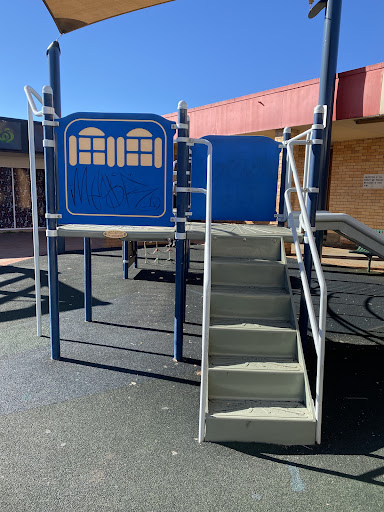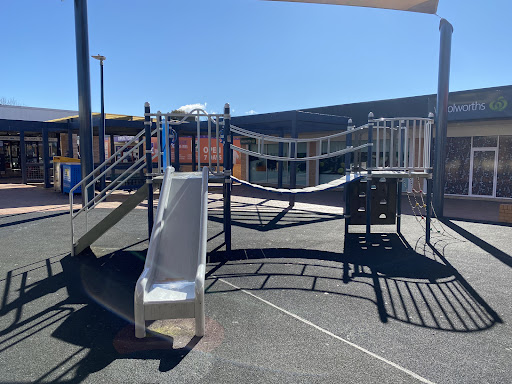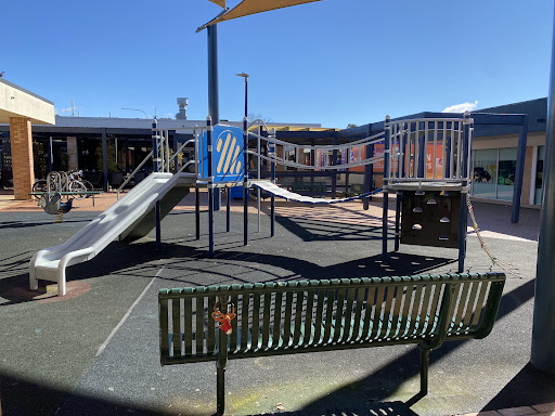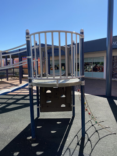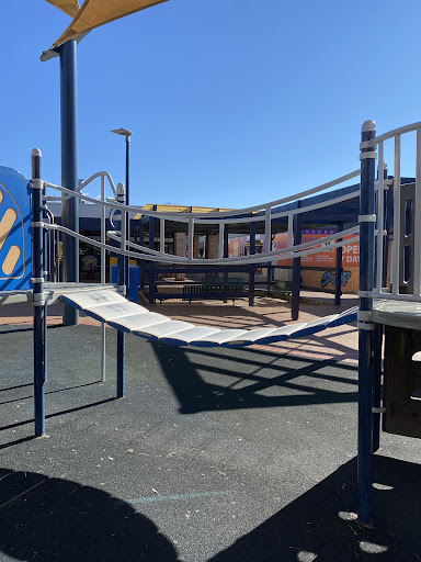 This playground, located conveniently near local shops, offers a stimulating play experience for school-aged children. It features a play structure with a chain ladder, rock climbing wall, viewing balcony, suspended metal bridge, stairs, sliding pole, and a small metal slide. The playground is enhanced by the presence of restrooms, a shaded bench area, and ample parking, with natural shade provided by surrounding trees.