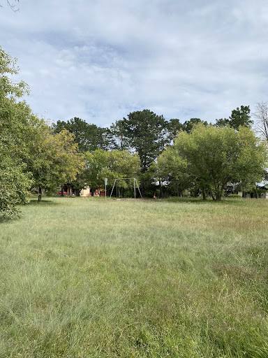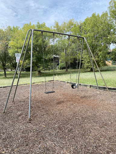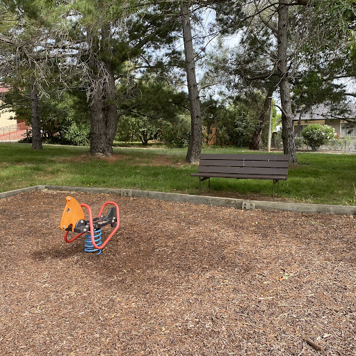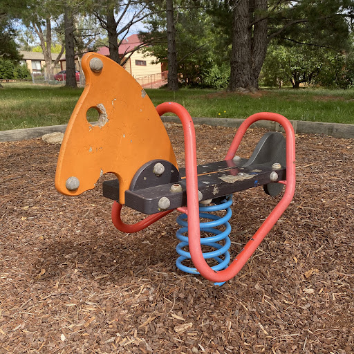 This playground provides ample green space and lovely tree shade, perfect for families looking for an outdoor area to relax. It features an old spring bench seesaw horse and a swing set that includes a standard seat and a toddler bucket seat with a chain. A bench seat is available under the shade of a tree, offering a comfortable spot to supervise children.