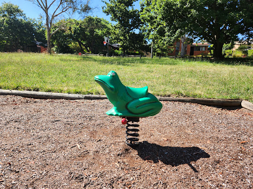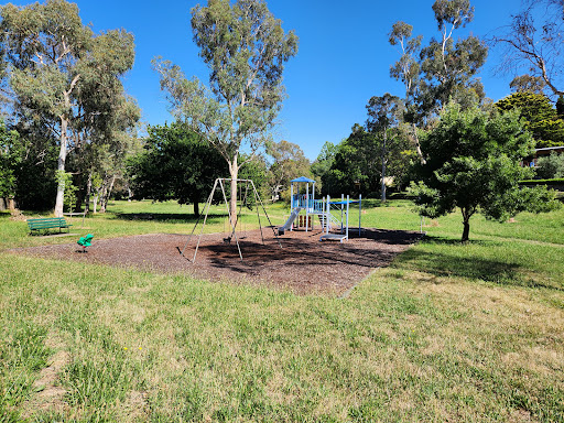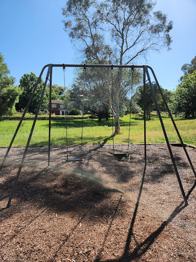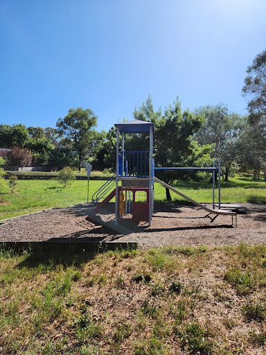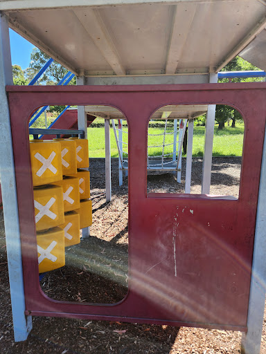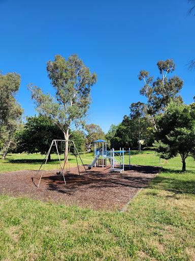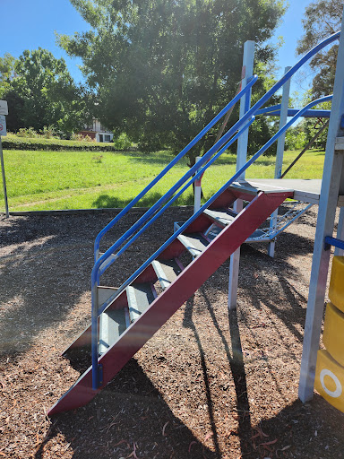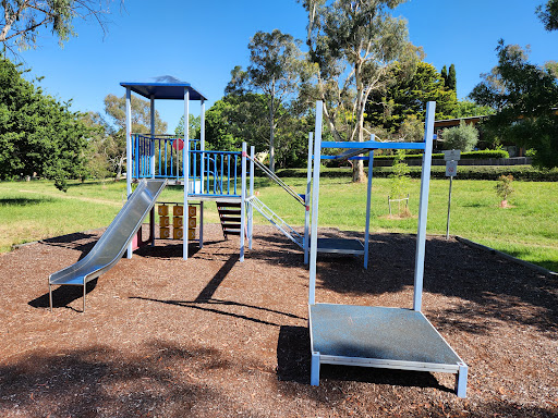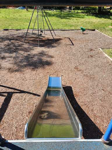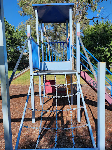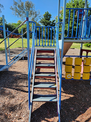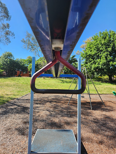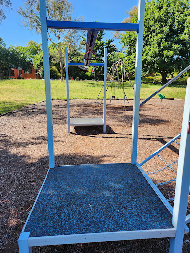 M Webster Playground is a great spot for children of various ages, particularly noted for its flying fox and adaptable swing set that accommodates both toddlers and older children. The play structure includes stairs, a chain ladder, a steering wheel, and a metal slide. Additional amenities like a picnic table and bench seats enhance the visitor experience, complemented by shade from nearby trees.