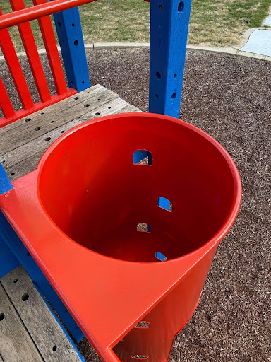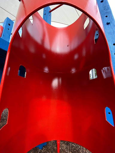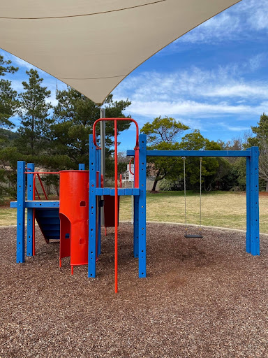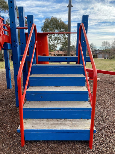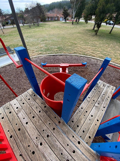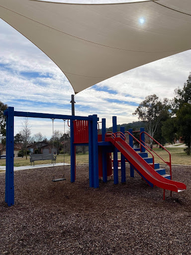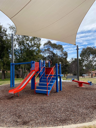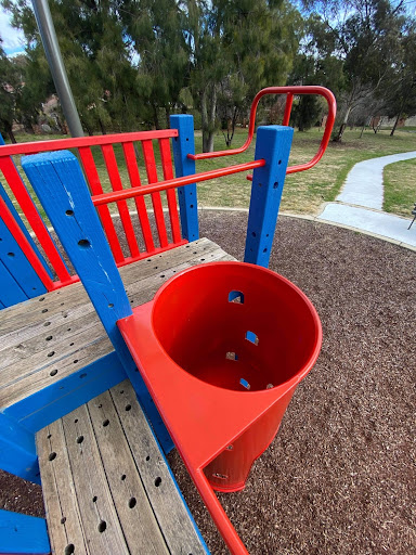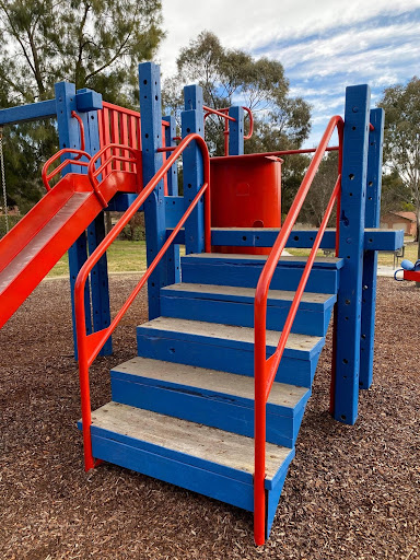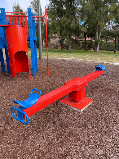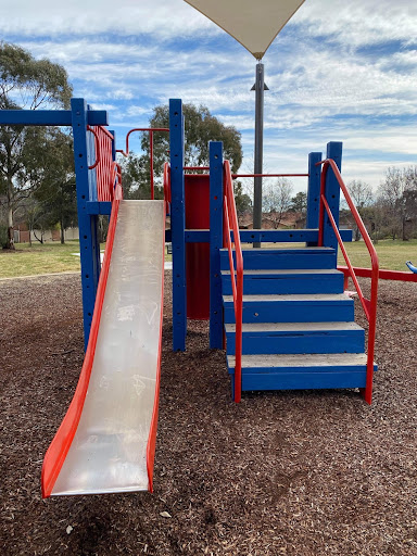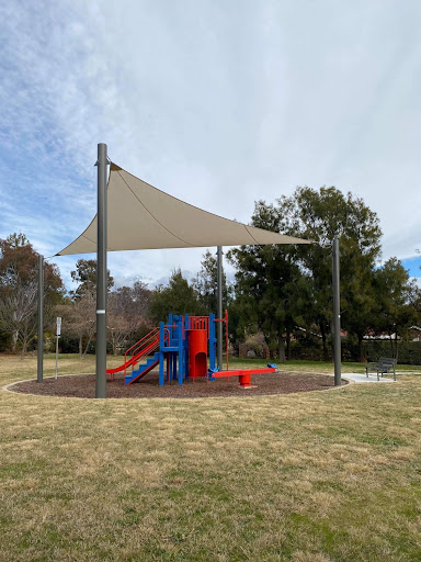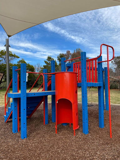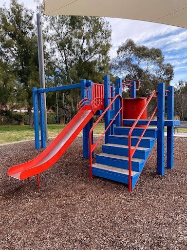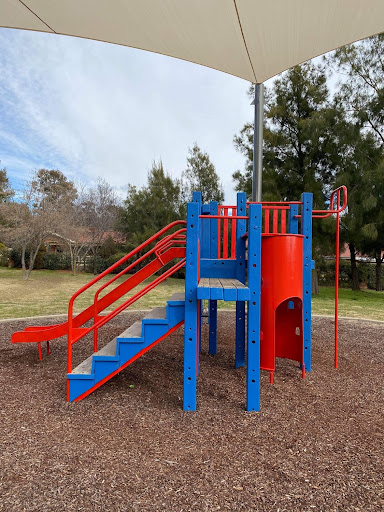 Rowntree Crescent Playground provides a fun play experience with its unique play structure. Key features include a vintage vertical metal climbing tunnel, a sliding pole, and a metal slide. The playground also offers a seesaw and swings, ensuring varied play opportunities. Families can make use of the bench seating located under tree shade.