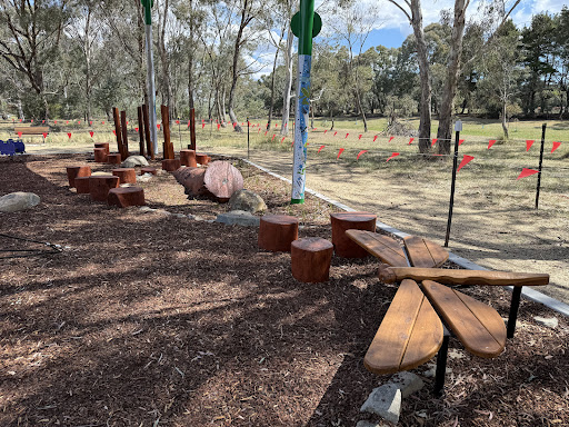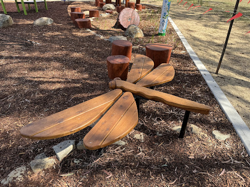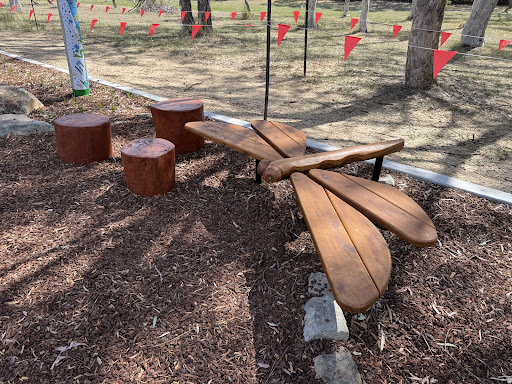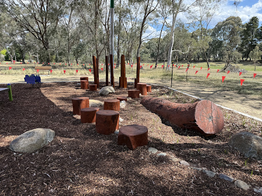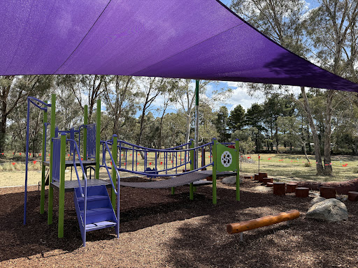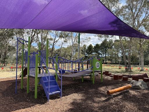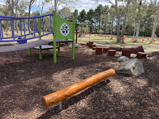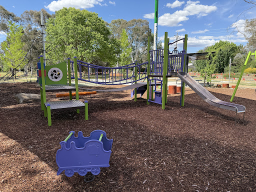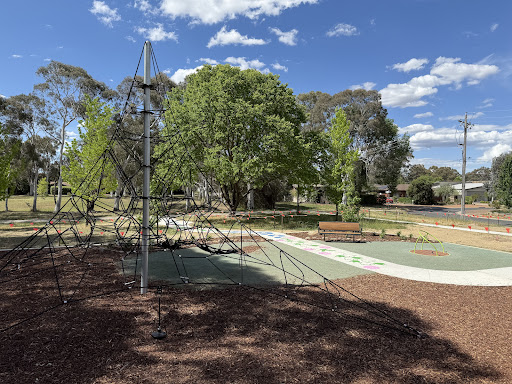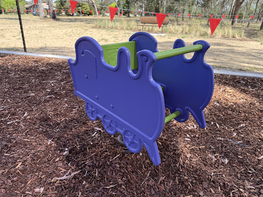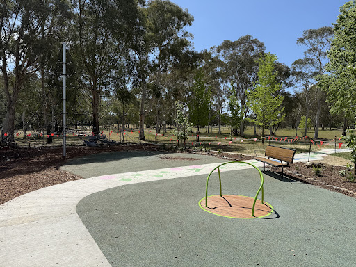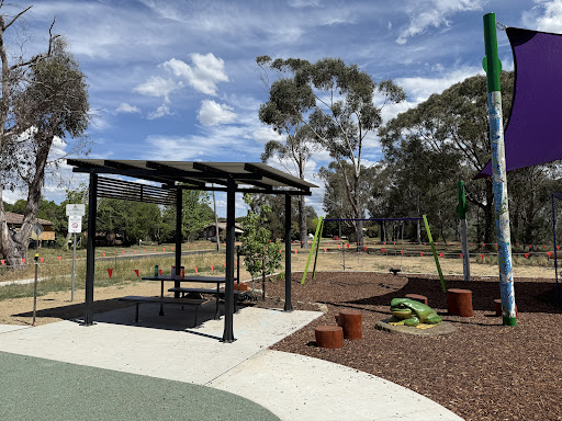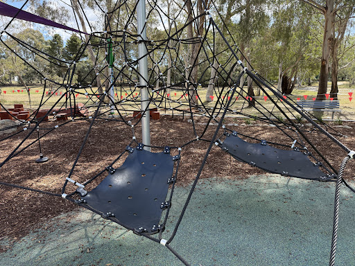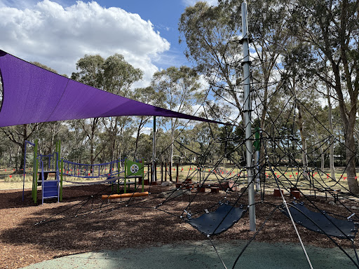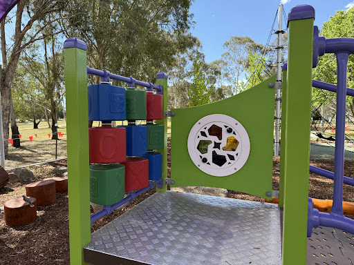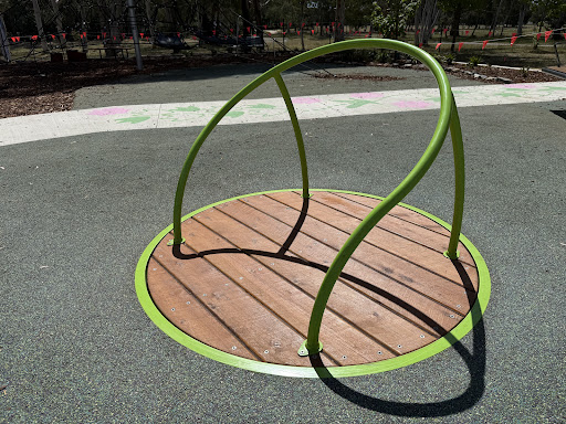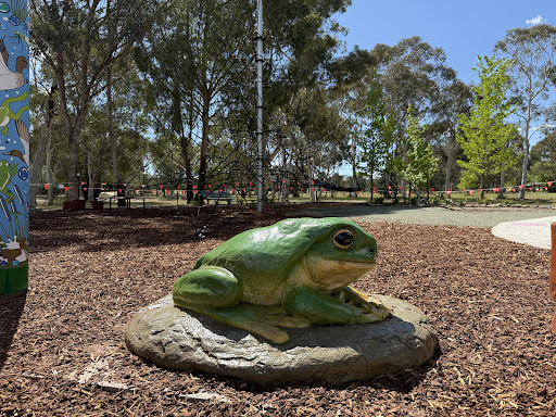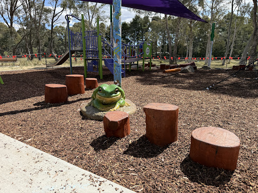 This upgraded neighborhood playground offers new features like a large rope tower, a floor-level carousel, and a charming frog sculpture. Families will appreciate the nature play elements and the artistic touches, including artwork on the footpath leading to the play area.