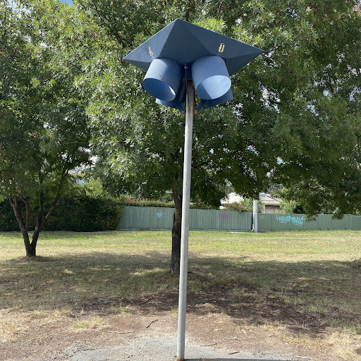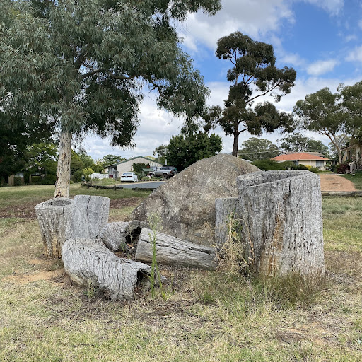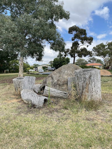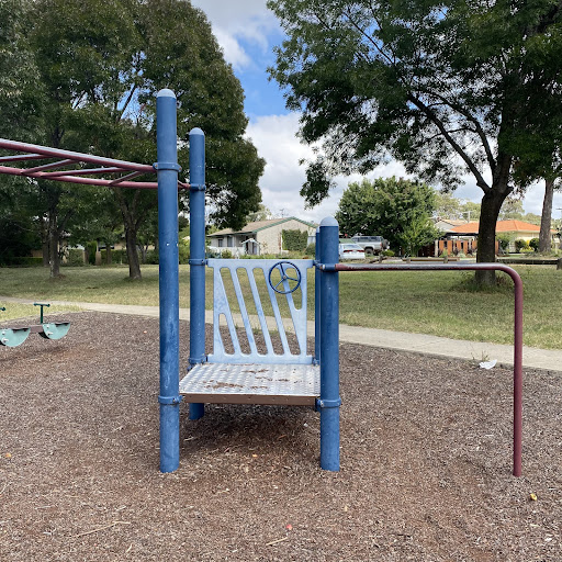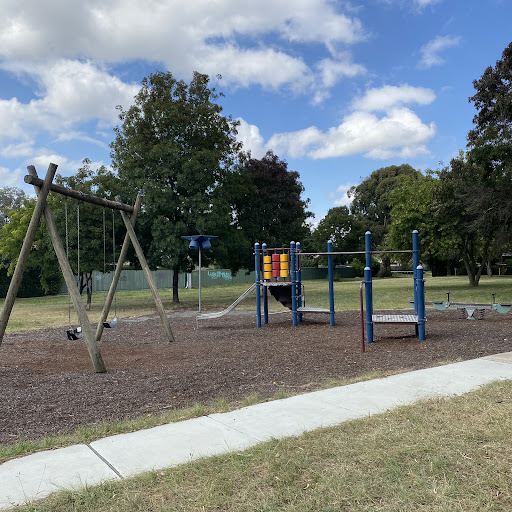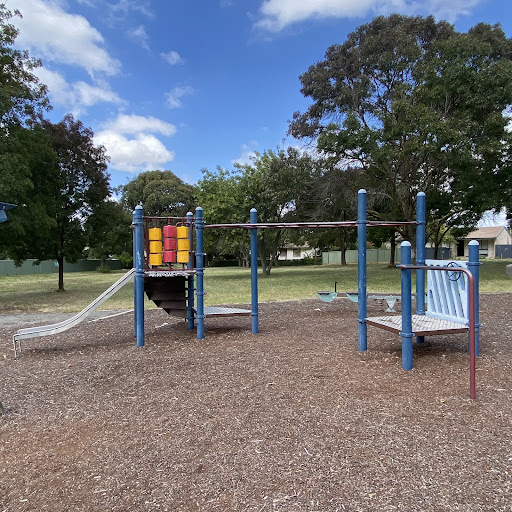 Attiwell Playground offers a recently upgraded play space with new flooring and paint, making it an inviting environment for children. It features a swingset with both standard and toddler seats, a four-seater seesaw, and a play structure that includes monkey bars and a slide. The playground is also enhanced by a large rock with wooden logs, providing natural play elements.