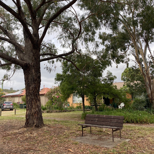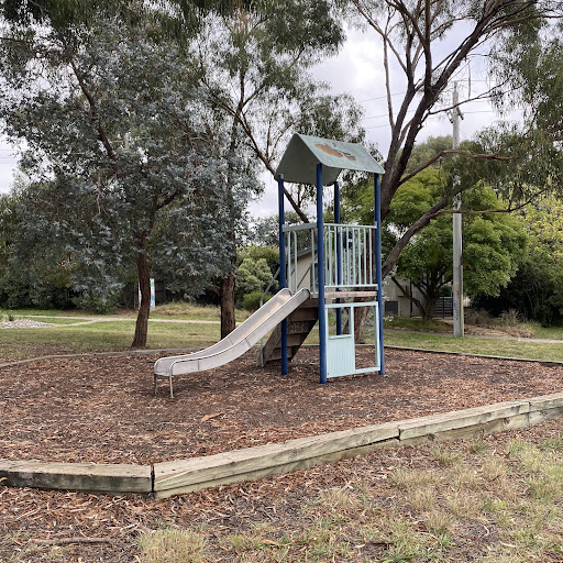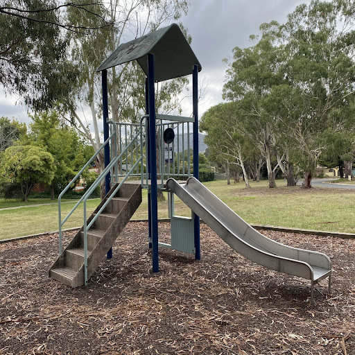 This playground features a small play structure with stairs, a steering wheel, and a metal slide. Visitors can enjoy the natural shade provided by trees, and there is a bench seat facing the play area.