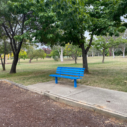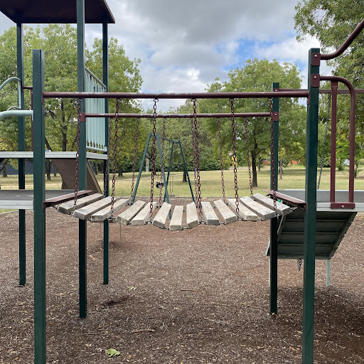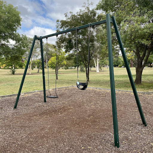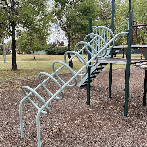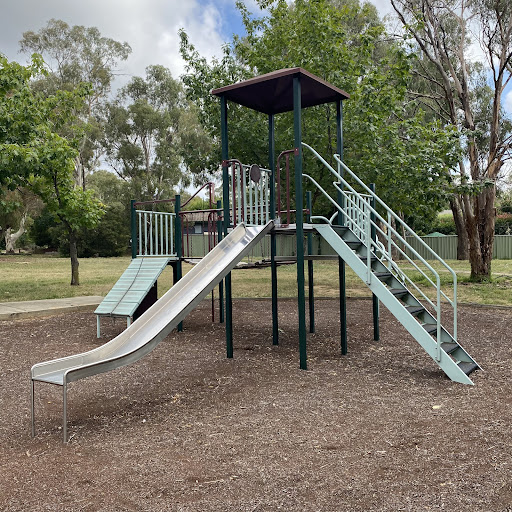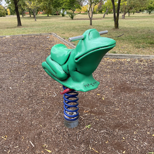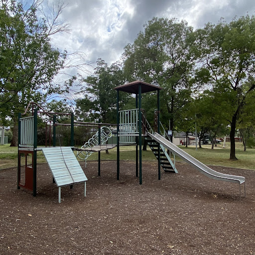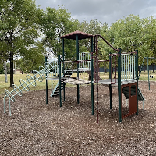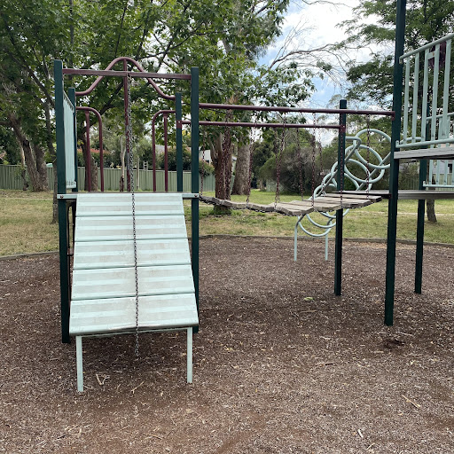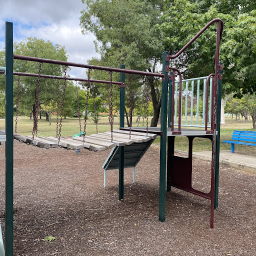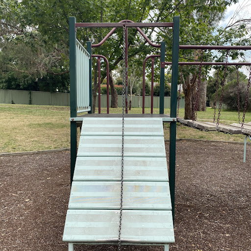 Kambah Shops Playground is a charming, older-style playground situated behind the local shops, providing a pleasant play experience under the shade of trees. It features a swingset with standard and toddler seats, a frog springer, and a play structure that includes a suspended plank bridge, metal slide, and climbing ladder. Its location near shops suggests convenient access to amenities.