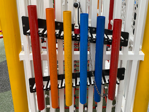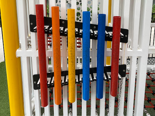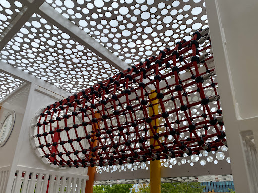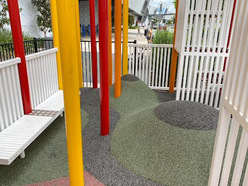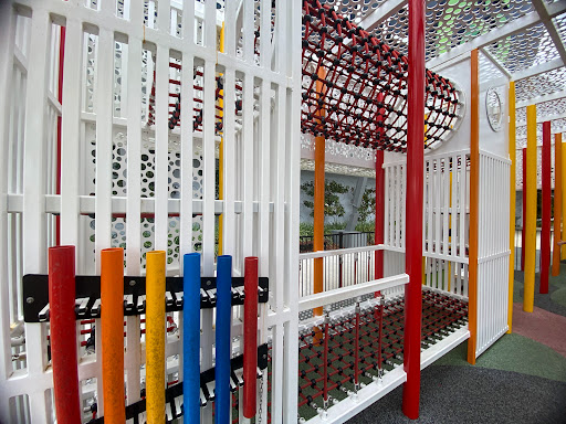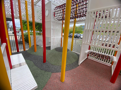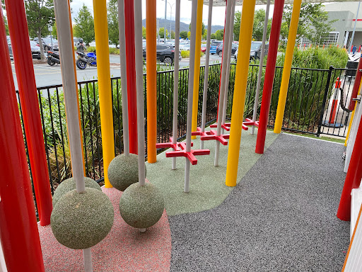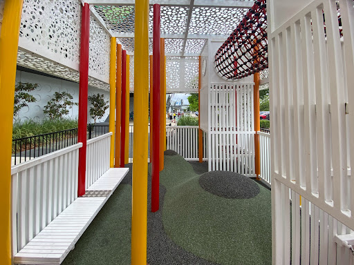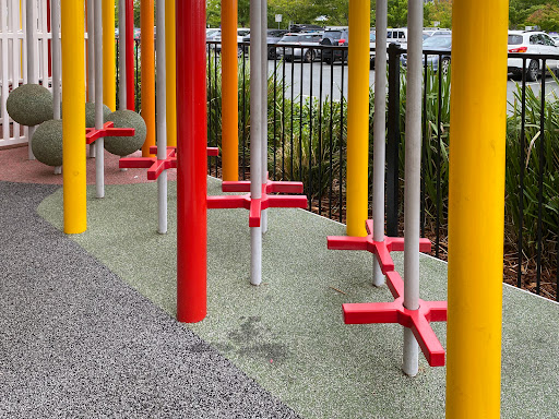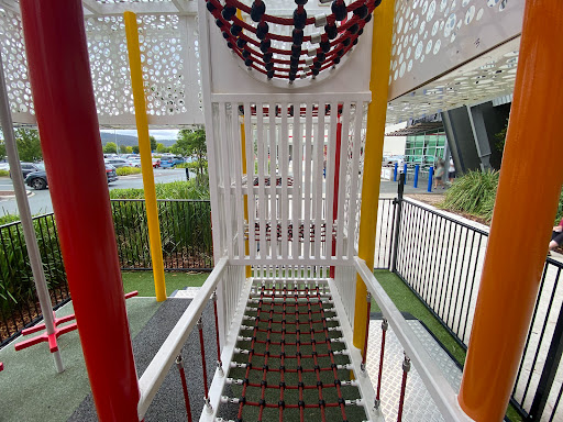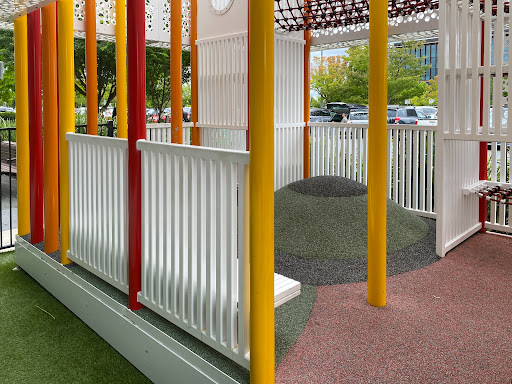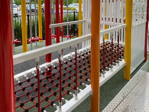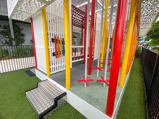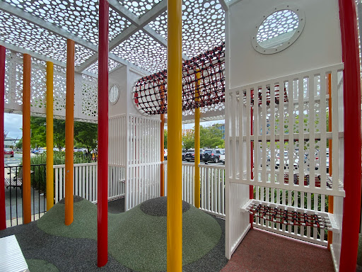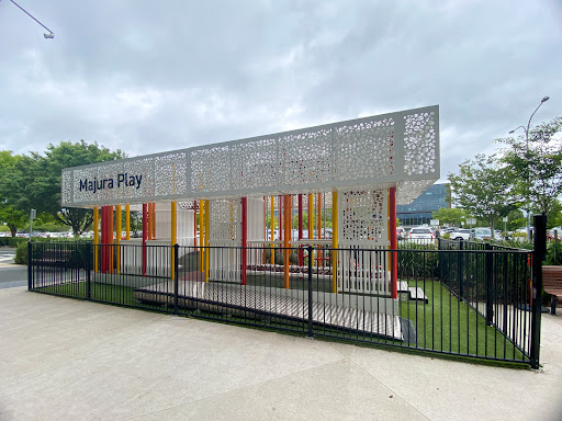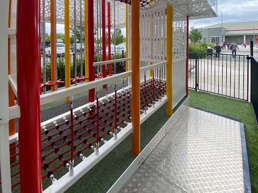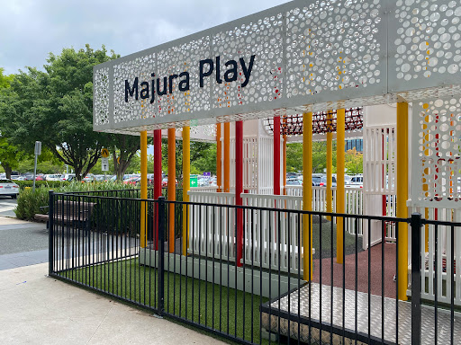 Majura Play offers a unique cube playground experience with a fully fenced enclosure and safety gate. Children can enjoy artistic elements like circles on the roof, musical wall xylophones, and netted obstacle courses with tunnels. The playground also features small hill mounds, providing varied play opportunities.
