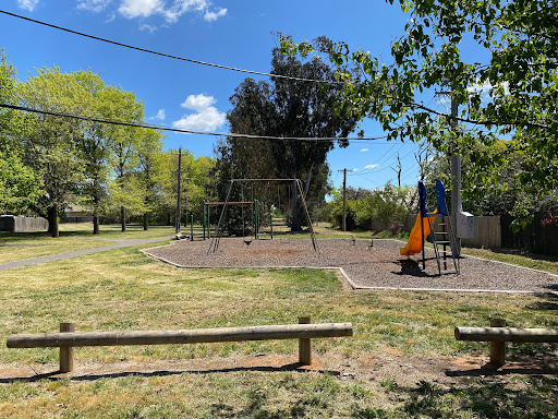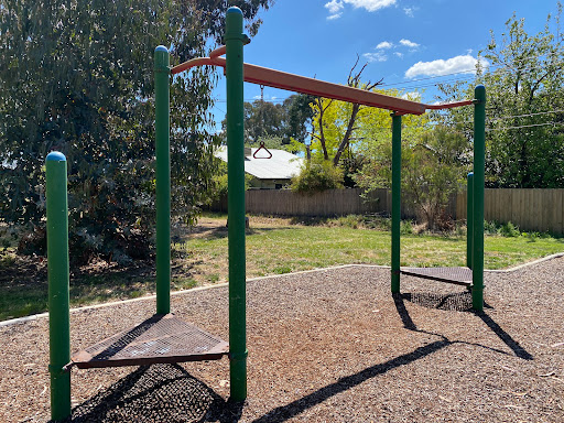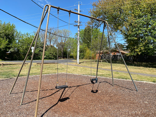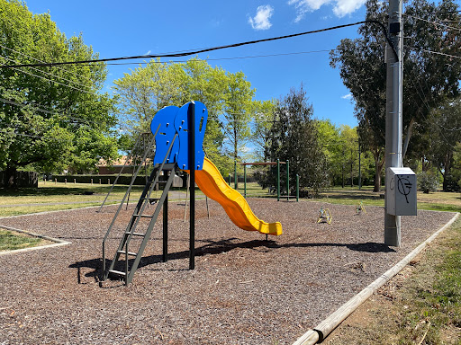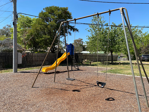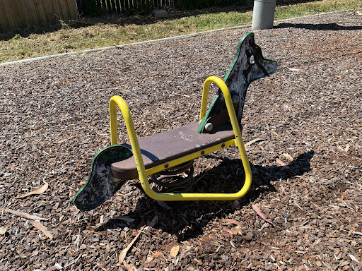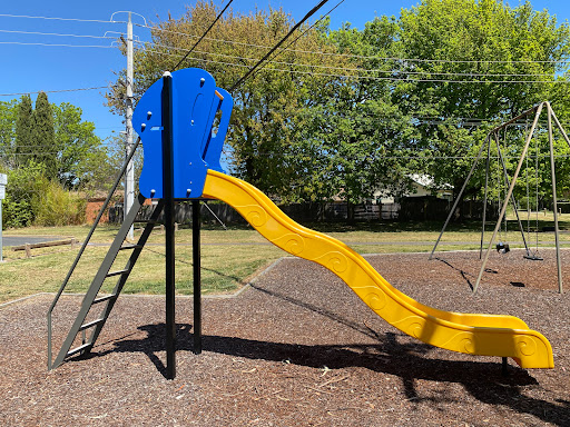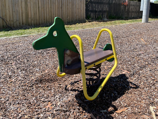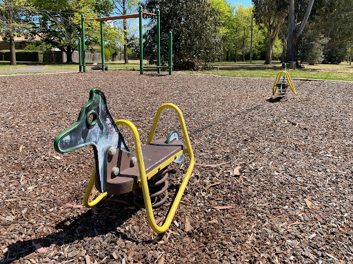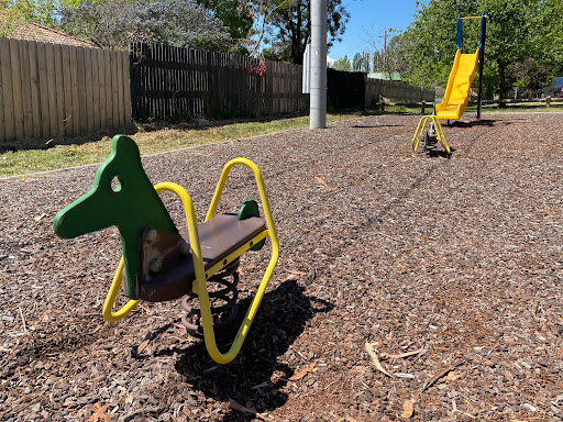 Narrabundah Local Playground is a compact and clean park that has seen recent upgrades, including a new, shorter plastic slide that replaces an older metal one, and a mini flying fox. The playground features two springy horse toys and a swing set with both standard and toddler seats. It is situated in a location with tree shade and has a fresh layer of tan bark as its surface, making it a pleasant spot for younger children.