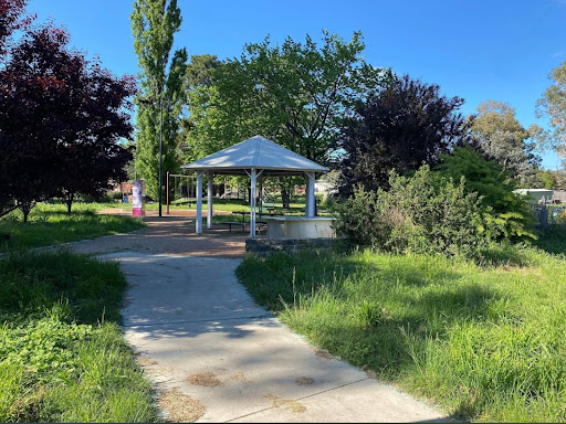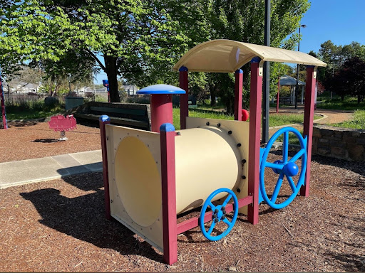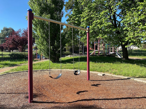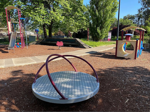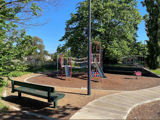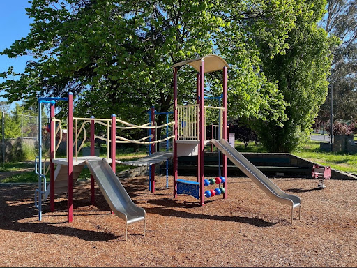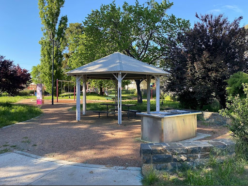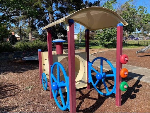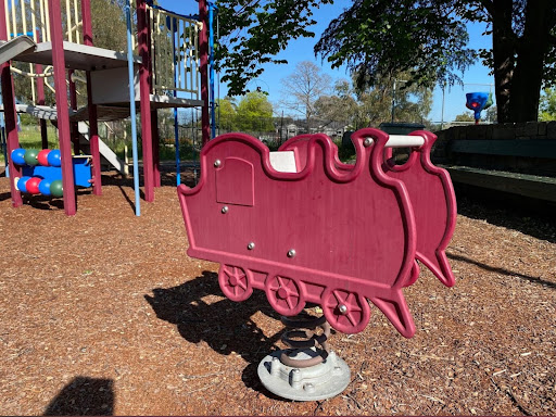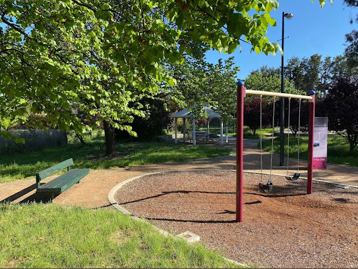 Gillespie Park is a delightful playground featuring a play train with a floor-level tunnel and beads, a swing set with toddler and standard seats, and a play structure with stairs, a climbing pole, a vertical rope tunnel, slides, and a suspended bridge. It boasts excellent amenities including toilets, BBQs with push-button start, picnic areas, a gazebo, and ample shade from trees. The park also offers a path for riding and is described as a calm and fresh environment.