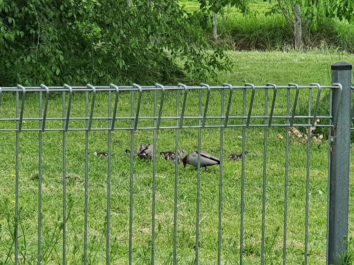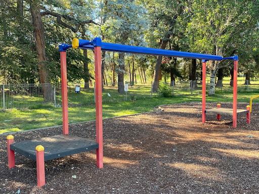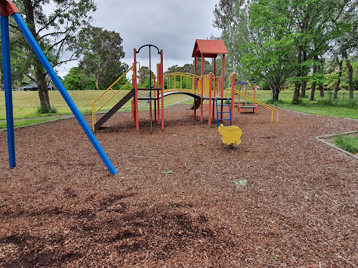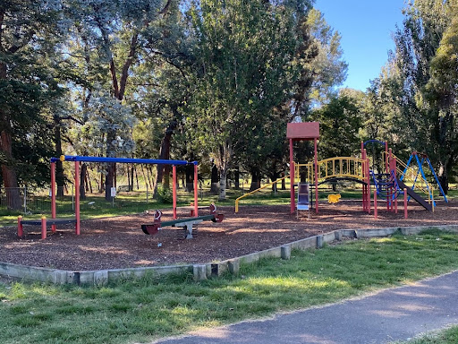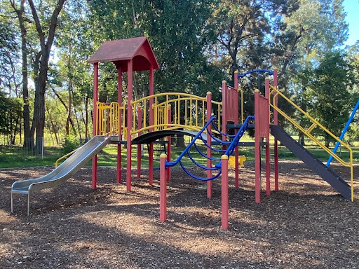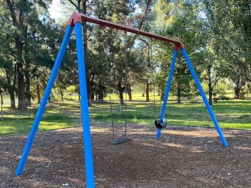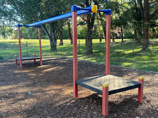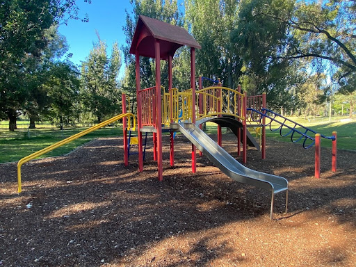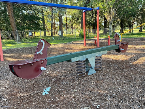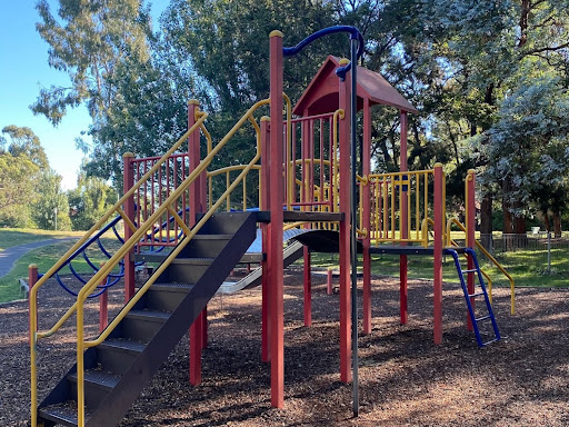 This delightful playground is nestled amongst tall trees, providing ample shade for a comfortable play experience. It features a mini flying fox, a bear springer, and a swing set, alongside a play structure with a metal slide and climbing elements. The nearby mini wetland and duck pond add an element of nature and creative play, making it a charming spot for families.