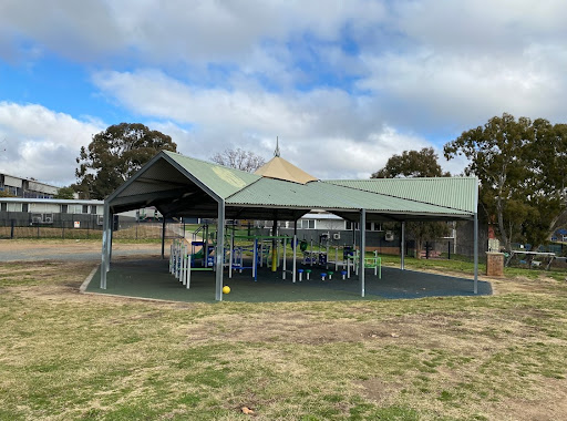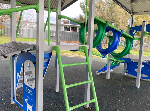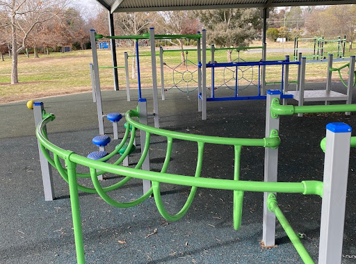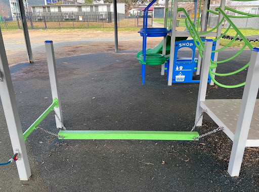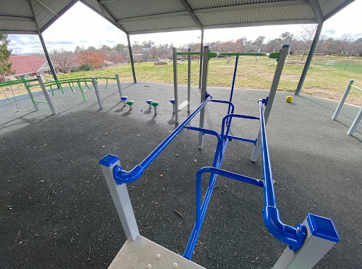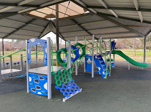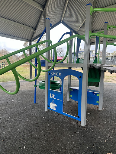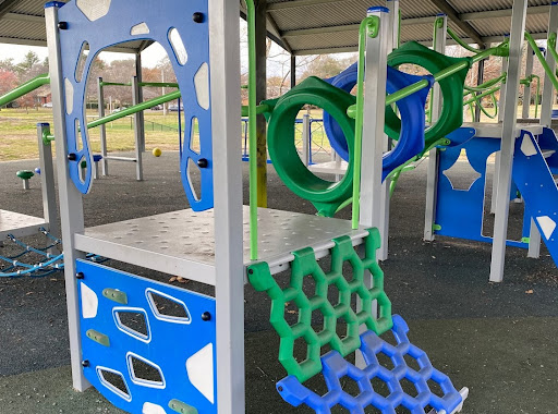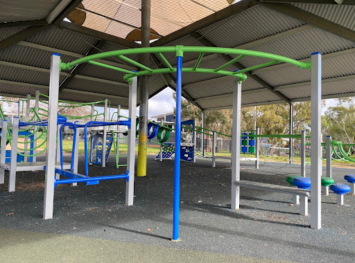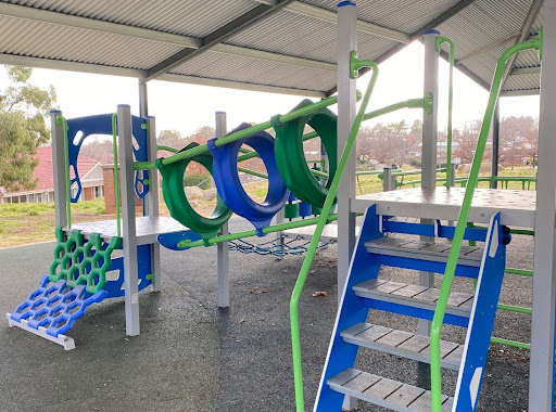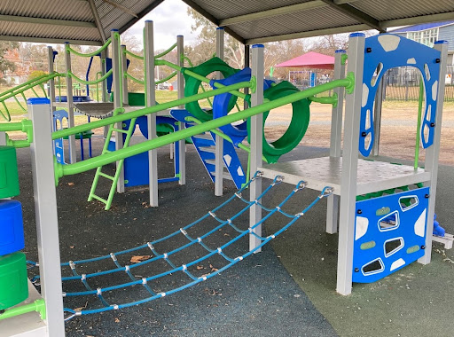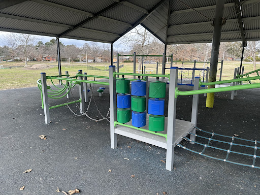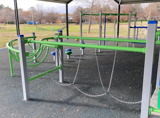 Voyager Park offers a fantastic active play experience, particularly for younger children, with a well-designed circuit featuring various obstacles and monkey bars. One play area is under shelter and includes extensive rope structures like spider webs and climbing walls, as well as a small slide. The park also provides access to sports facilities such as a basketball court, netball court, and a fenced soccer area, along with a mountain bike skills track.