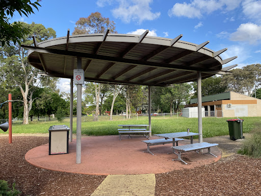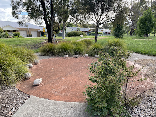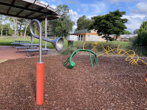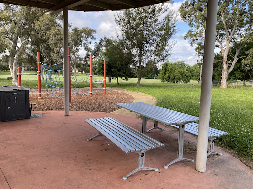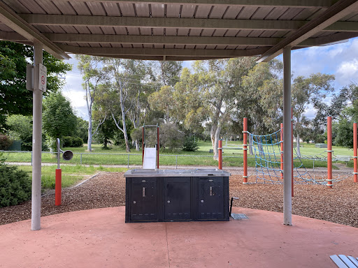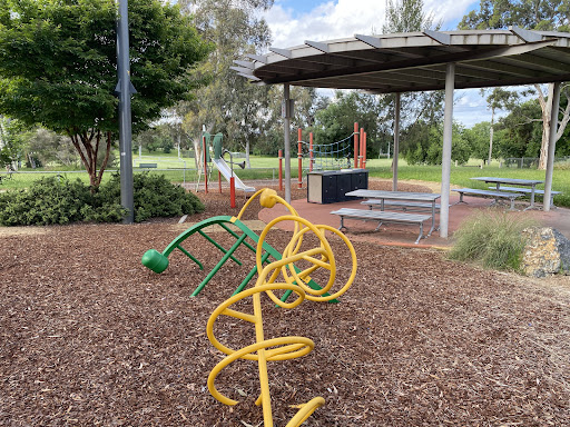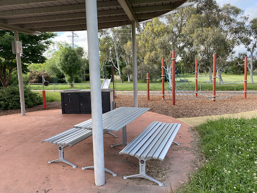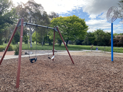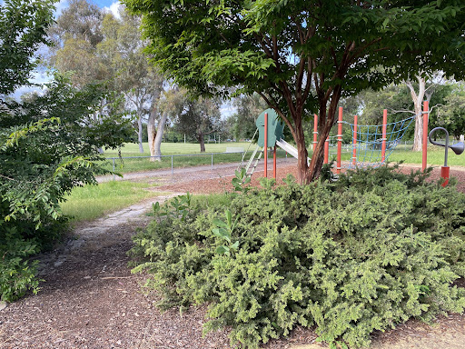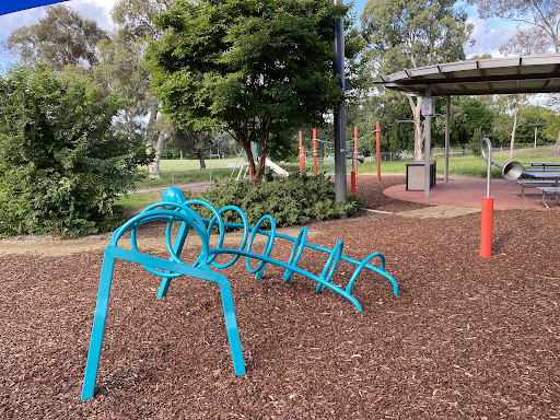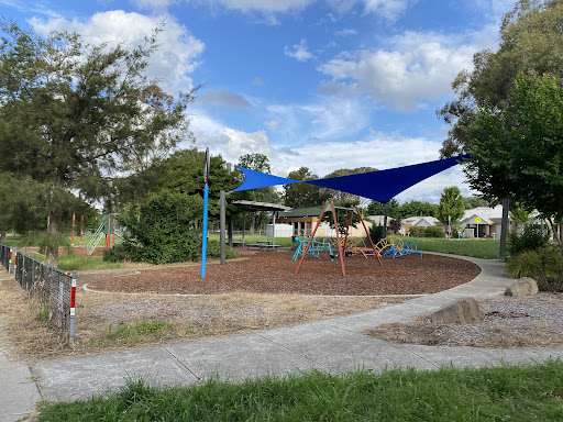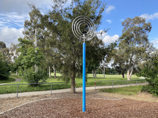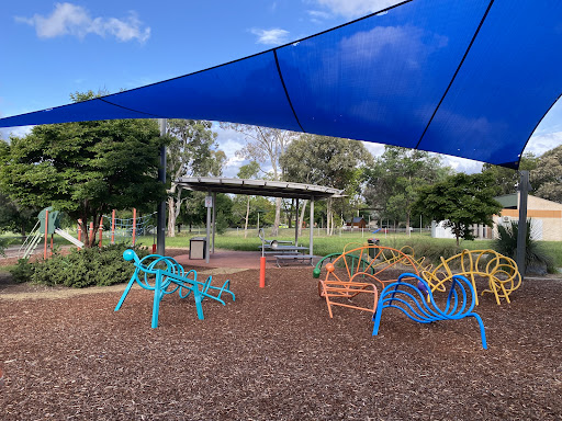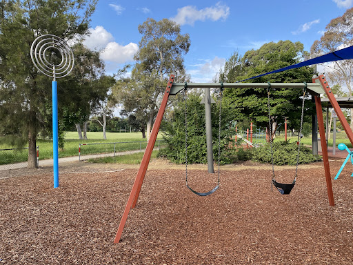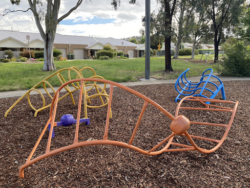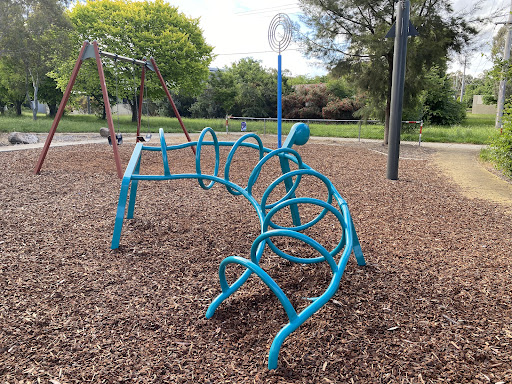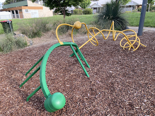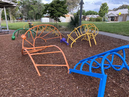 This community playground offers a variety of engaging play equipment, including a metal slide, swing set, and an obstacle play structure with various climbing features. Unique artistic elements, such as colorful metal climbing poles and a sculpture garden, add an interactive dimension for children. The playground also features shaded picnic areas with BBQ facilities, making it a great spot for family outings. A fitness trail nearby offers additional recreational opportunities.