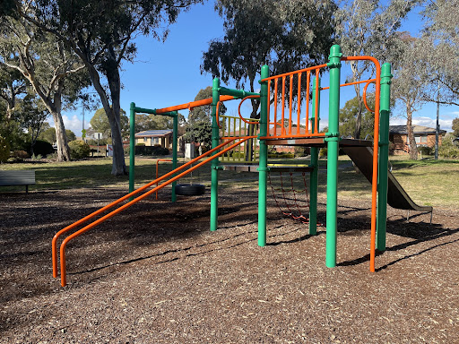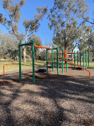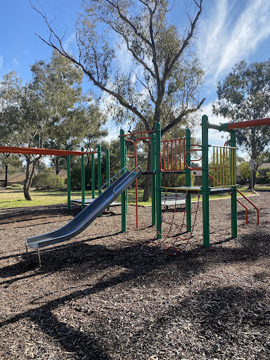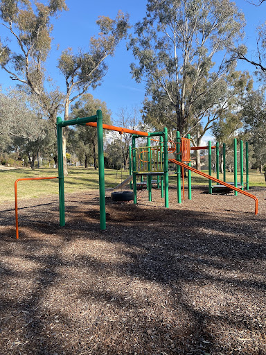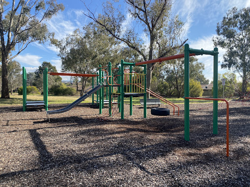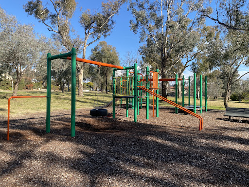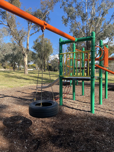 This playground features a fun jungle gym with a variety of equipment, including slides and a tire swing. Younger children will enjoy the spring horses. The area is well-shaded by trees, providing a comfortable environment for families. Several benches are available for seating.