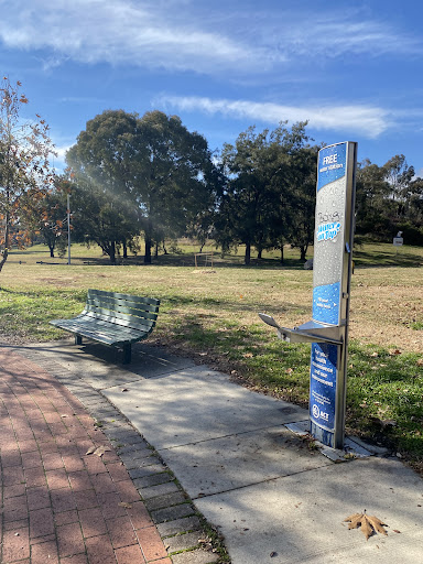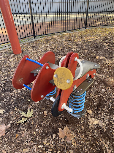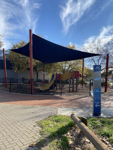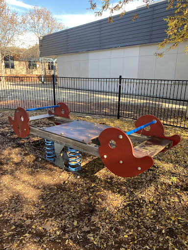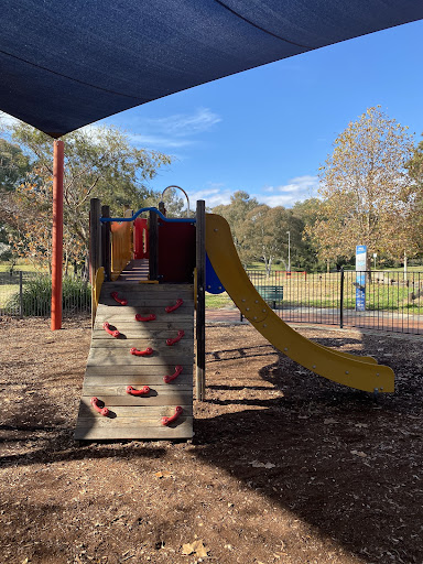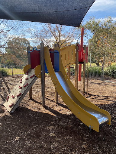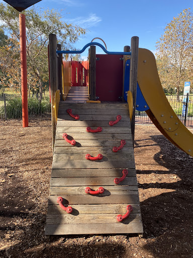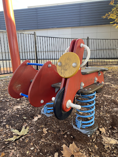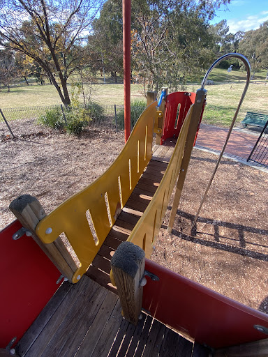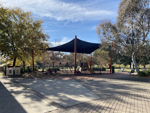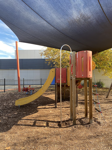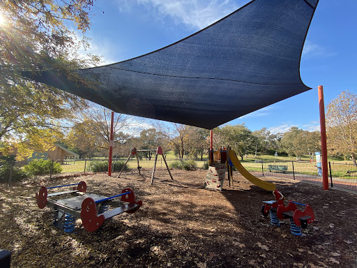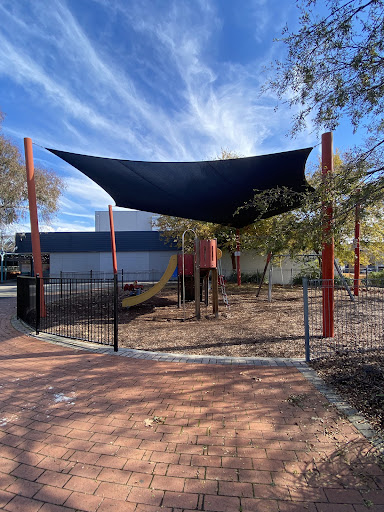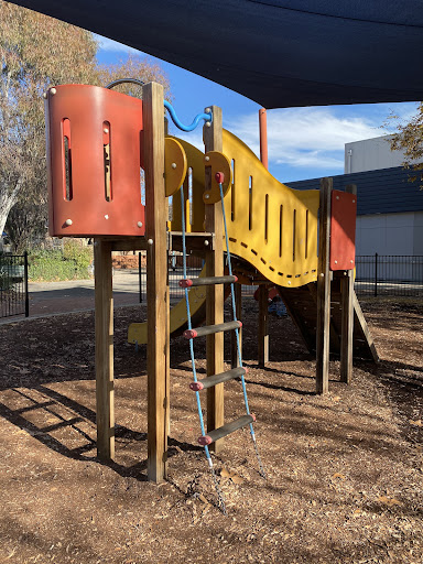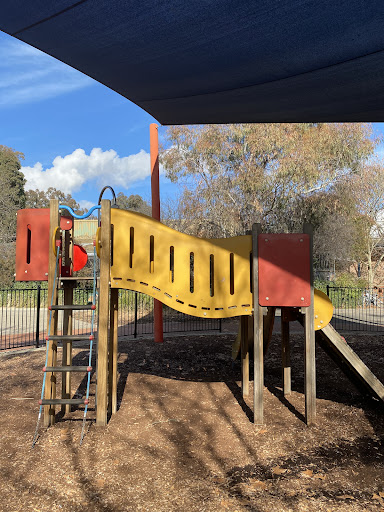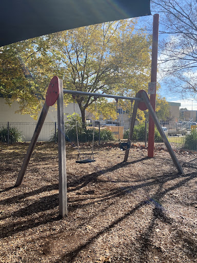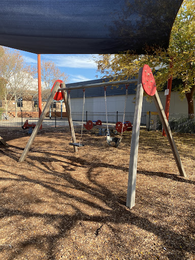 This playground is well-suited for younger children under 9, offering a variety of equipment including a swing set with both standard and toddler seats, a motorcycle springer, and a play structure with climbing features and a small metal slide. It is mostly fenced, providing a secure environment, and is conveniently located near Cooleman Court amenities, including restrooms, shade, and parking.