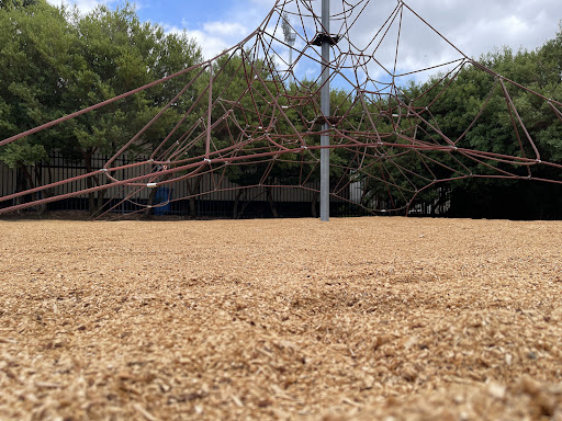 This fenced playground is a great spot for young children, featuring toddler-friendly equipment like swings and a slide, as well as climbing structures suitable for older kids. The area is well-shaded with good seating for parents, and its location next to open grass provides ample space. Nearby cafes and street parking add to the convenience for families.