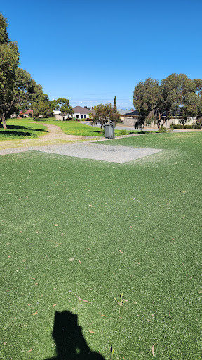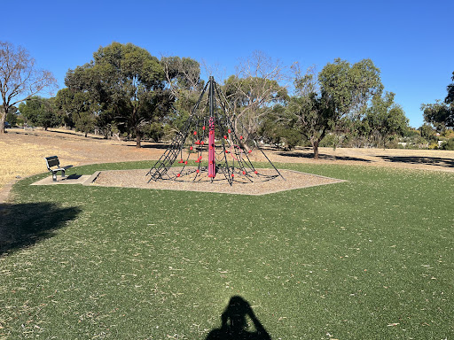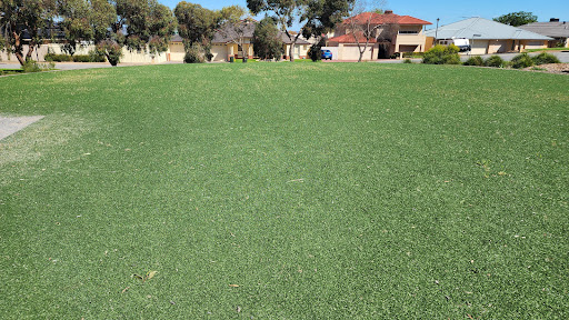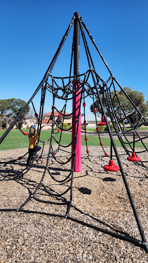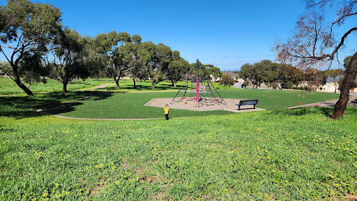 This playground features a climbing structure and artificial turf. It is situated within a reserve with a bench and a bin.