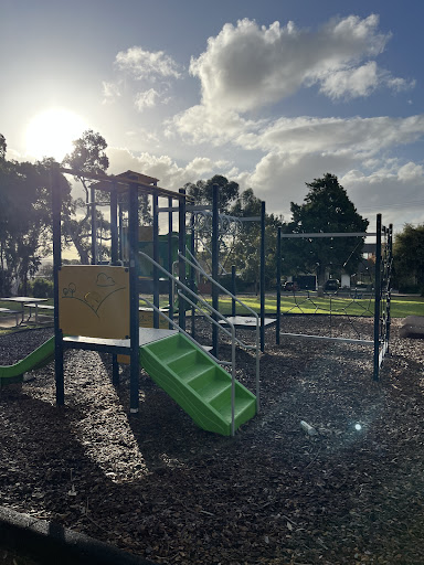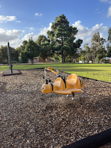 This playground features a variety of equipment, including a larger slide and a smaller one suitable for toddlers. It also offers old-style swings, a seesaw, and a bumble bee bouncer. A cool spider web climbing frame provides an additional element of fun. The area includes a big grassy space for running around and picnic tables.
