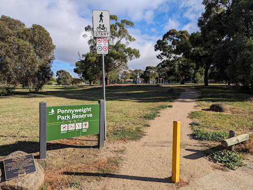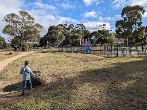 Pennyweight Park playground offers a well-regarded, fenced play area perfect for younger children, featuring swings, a slide, a climbing frame, and a seesaw. The park is adjacent to a large, open grassy field, providing ample space for running and sports. Interesting sculptures are scattered throughout the park, adding an artistic element. This community space is noted for its friendly atmosphere, making it a great spot for families.