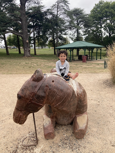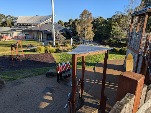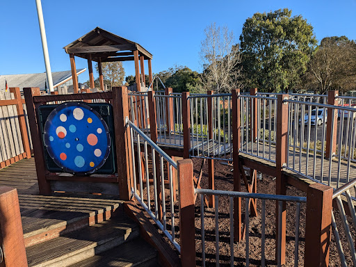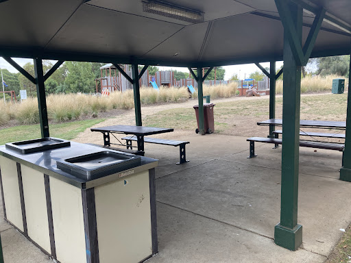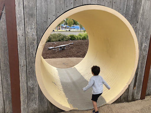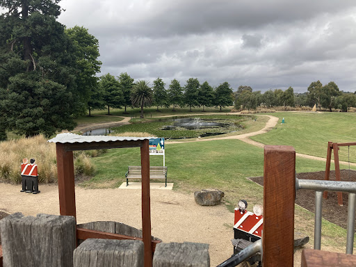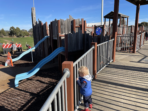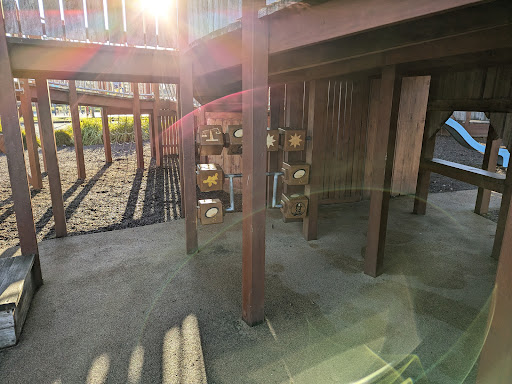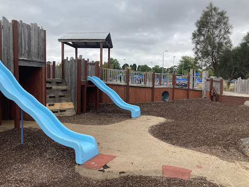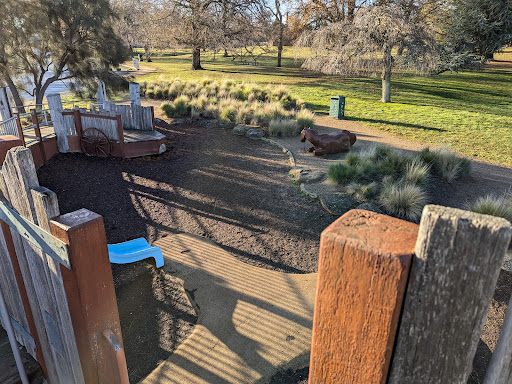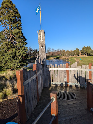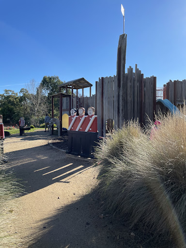 This themed playground offers a unique stockade design that sparks imaginative play for children. Families can enjoy the various climbing elements, slides, swings, and musical instruments. The surrounding area provides ample green space for running, picnic tables, BBQs, and shaded seating, making it a great spot for family outings. Additionally, restrooms and a drinking fountain are conveniently located nearby.