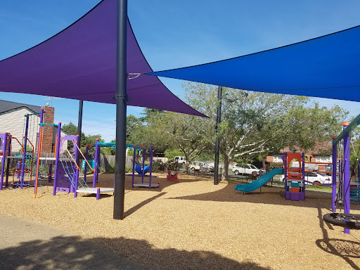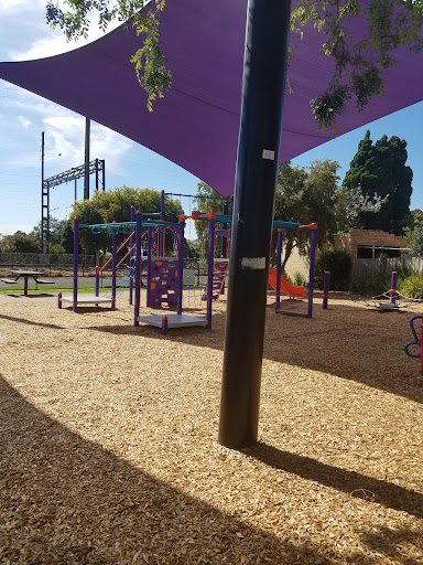 This park is a hit with families, particularly for its safety features like a physical fence and shade sails. The playground boasts a colorful and modern design with a beloved train theme, complete with a play train, slides, swings, monkey bars, and a carousel. The frequent passing trains are an extra attraction for little ones. Amenities such as a drinking fountain, picnic tables, and benches add to the convenience for visitors.