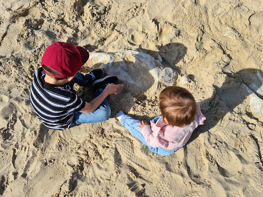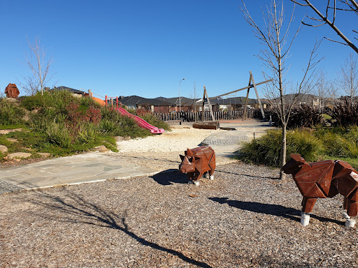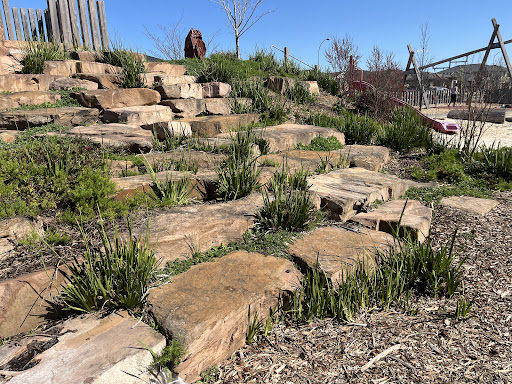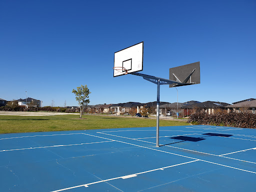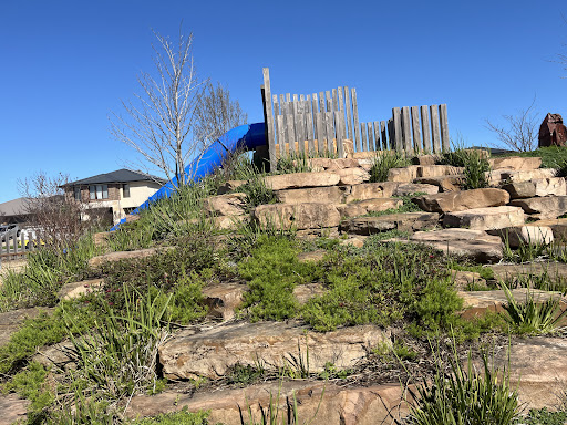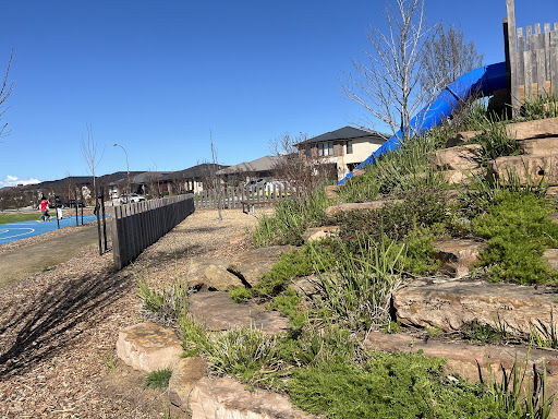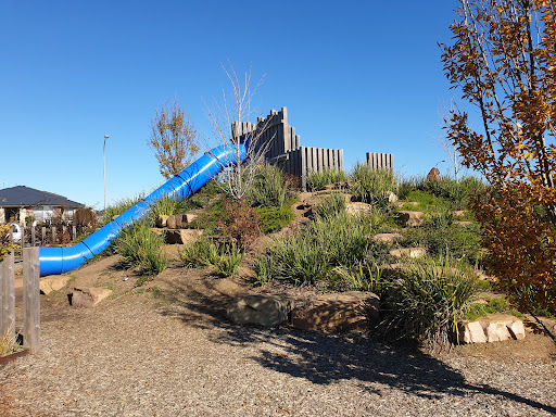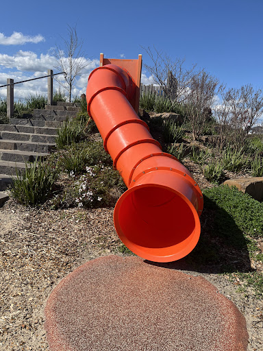 This park offers a fantastic play experience with multiple slide options suitable for different abilities. A large sand pit at the base of the smallest slide features a dinosaur fossil for excavation, adding an element of discovery. Kids can also enjoy the water pump and swings. The park also includes basketball courts and open grass areas, making it suitable for active families and providing space for jogging or walking.