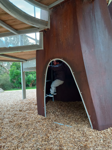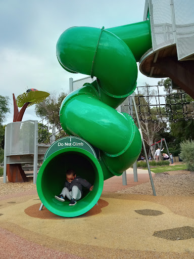 This playground is nestled within beautiful botanical gardens, offering a visually appealing and peaceful environment for families. The unique, forest-themed play structures, including a slide resembling a large tree and a multi-person seesaw, provide a distinctive play experience. The park is well-maintained, features artistic touches like wooden animal sculptures, and offers convenient amenities such as nearby trash cans and toilets.