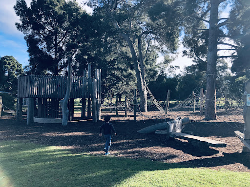 Queens Park Playground is a highly recommended destination that beautifully integrates with its natural surroundings, offering an adventurous atmosphere for children. It features impressive climbing equipment, including rope-based elements intertwined with timber and trees, providing a unique play experience. The park boasts plenty of shade, ample open space for running and ball games like soccer, and convenient BBQ areas and toilets. Its integration with nature and abundance of trees makes it a pleasant and scenic location for families.