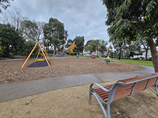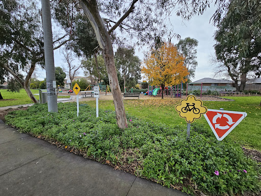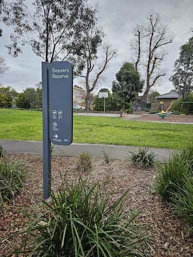 Beevers Reserve Playground is a charming local park that offers a themed Australian outback experience with a kangaroo sign and a short walking path. It features a small play area suitable for toddlers, along with a basketball hoop and a larger grassy area perfect for picnics and casual games. Parents can find seating spots to relax while their children play.