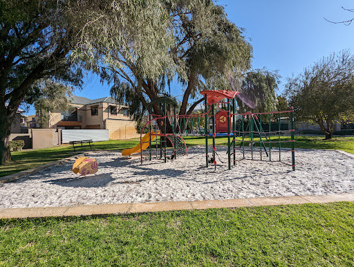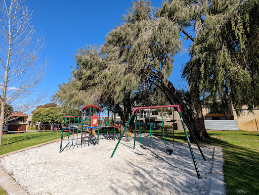 This quaint playground is nestled among houses, offering a peaceful retreat for families. It features a swing set and a small play area, perfect for younger children. Parents can relax on the park bench, keeping a close eye on their little ones in this cozy setting.