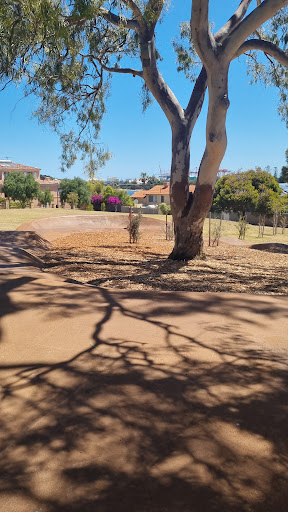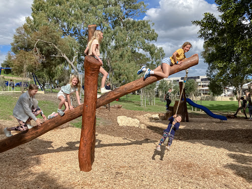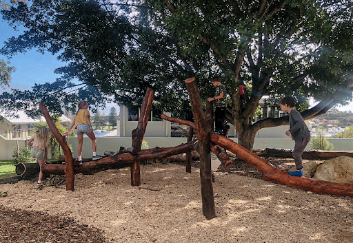 Gourley Park Nature Playground is a nature-based play space designed to connect children with nature. It features a timber playground with a popular pump track that children love. The park includes a balancing log nest for climbing and free play, as well as a stump slide for younger children. Large limestone boulders offer a viewing platform to the Swan River, and natural, sustainable materials are used throughout.