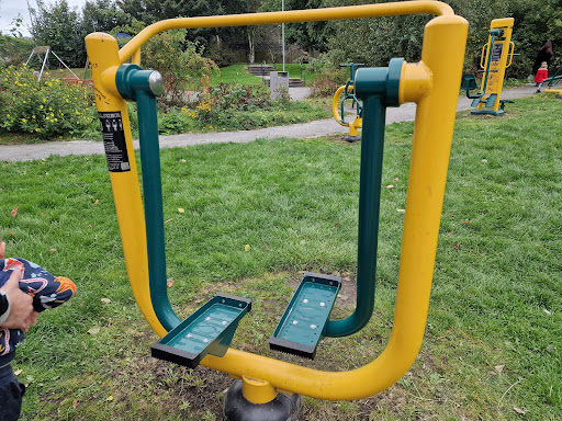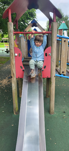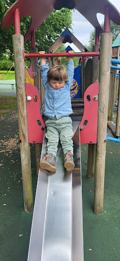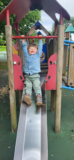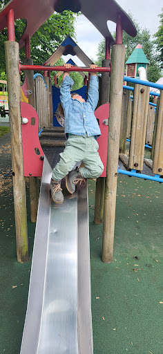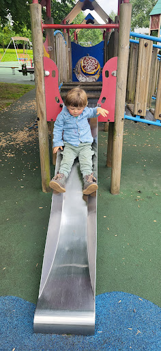 This is a well-maintained and safe playground offering a variety of equipment suitable for children of all ages, from babies to teens. It features a good selection of slides, swings, and a zip line, along with an outdoor gym for adults. The playground is described as clean with soft ground and surrounded by beautiful flowers, making it a pleasant place for a family outing.