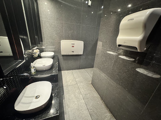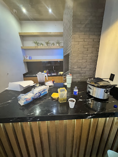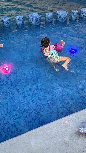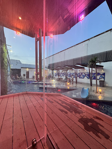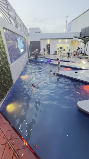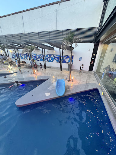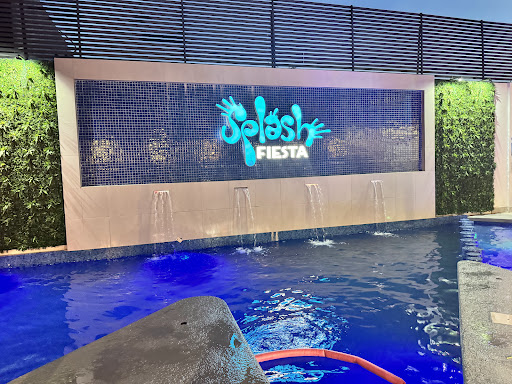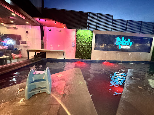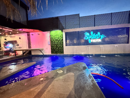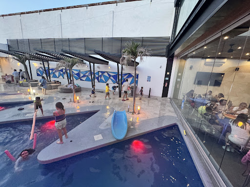 SPLASH FIESTA is a highly recommended and super cool palapa, celebrated for its modern and beautiful design and excellent staff. It features a huge pool with different levels, including a wading pool and a small slide, suitable for various ages. The facility also boasts spacious, clean indoor bathrooms with a baby changing table, shaded seating, and an enclosed, heated area with glass walls for good parent visibility.