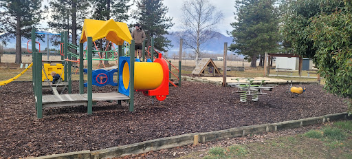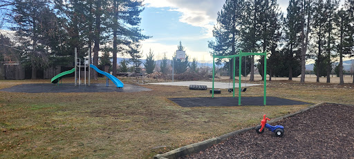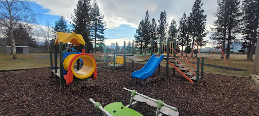 A great play area designed for young children, featuring larger slides that cater to older kids and a basketball area. It also includes a sandpit and ample space for children to run around. The presence of a bike pump track adds to the recreational activities available.