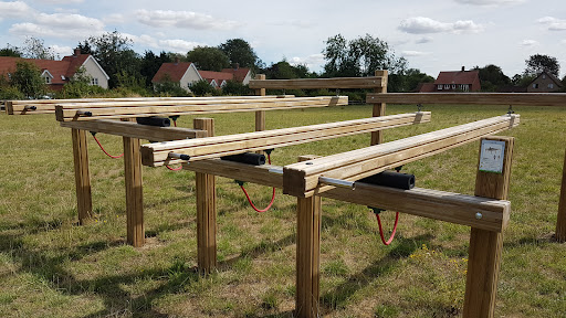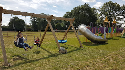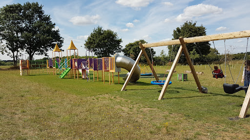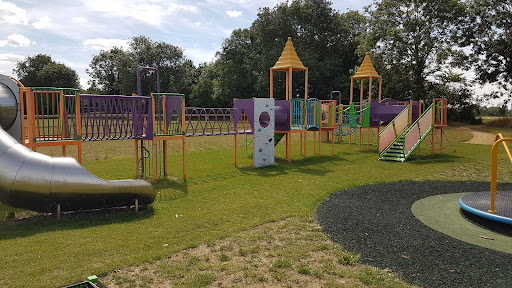This community playground offers a good selection of equipment for children, including swings, a roundabout, an obstacle course, a slide, and a climbing frame. It’s situated in a nice community field with parking available, making it a convenient spot for families to visit. The presence of outdoor fitness equipment for adults also adds to the park’s appeal for varied recreational use.