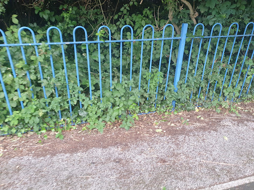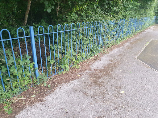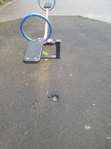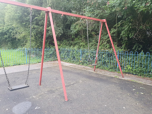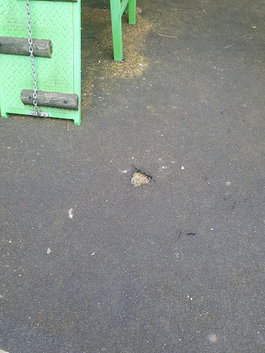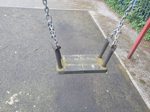 This playground features a swing set and a soft fall surface, though reviews indicate some equipment is in disrepair and the overall condition is neglected.