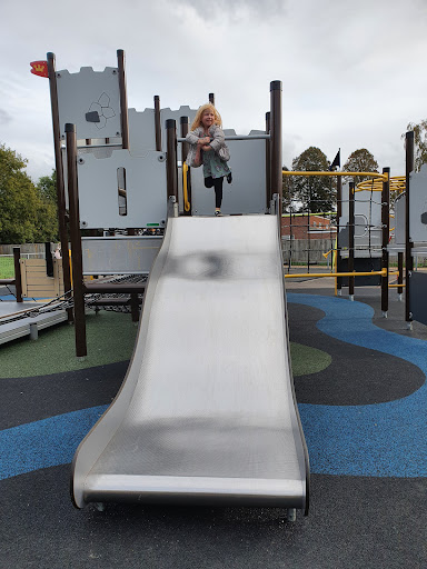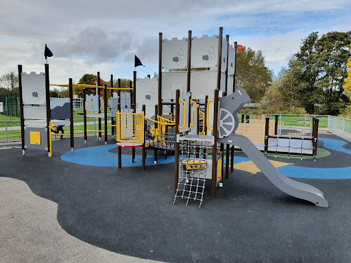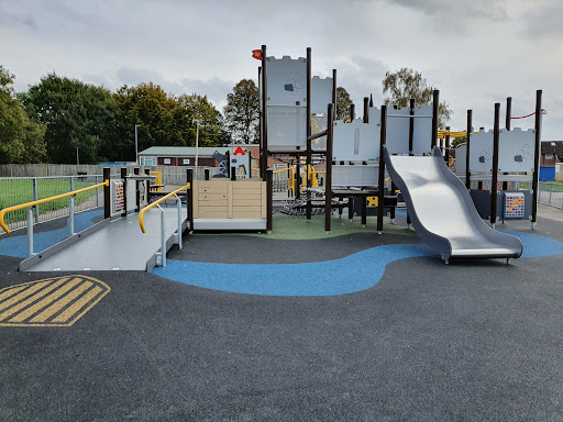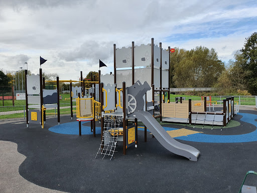 This playground is a great destination for families, offering activities suitable for children of all ages. It features large climbing frames for both younger and older kids, as well as a spacious field for running and playing. The inclusion of a wheelchair-accessible area makes it a welcoming spot for everyone.